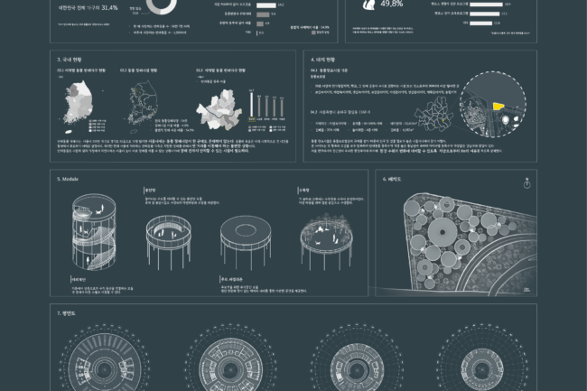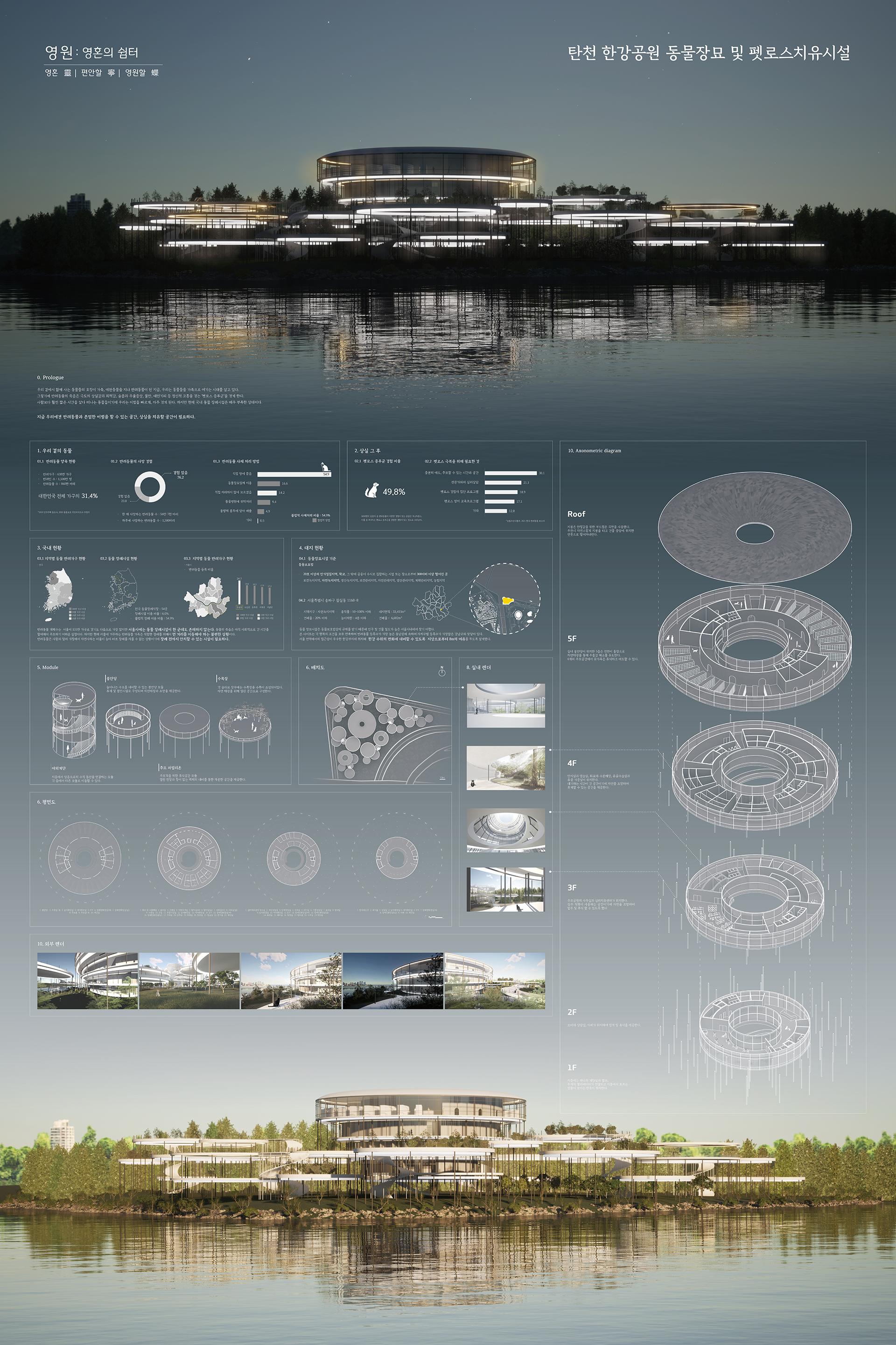 또한 동물 장묘시설은 동물보호법상의 규제를 받기 때문에 인구 및 건물 밀도가 높은 서울시내에서 찾기 어려운 상황이다. 본 사이트는 각 항목의 조건을 모두 만족하며 반려동물 등록수가 가장 높은 동남권에 속하며 자치구별 등록수가 가장 많은 강남구와 맞닿아 있다. 서울 전역에서의 접근성이 우수한 한강부지로 수위의 변화에 대비할 수 있도록 100년주기의 홍수지도를 기준으로 안전성을 확보하고자 했고 따라서 지상으로부터 8m의 여유를 두도록 설계했다.
