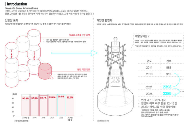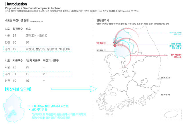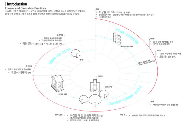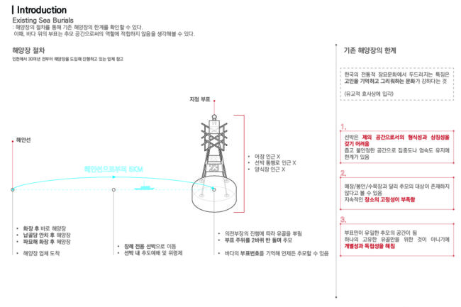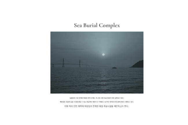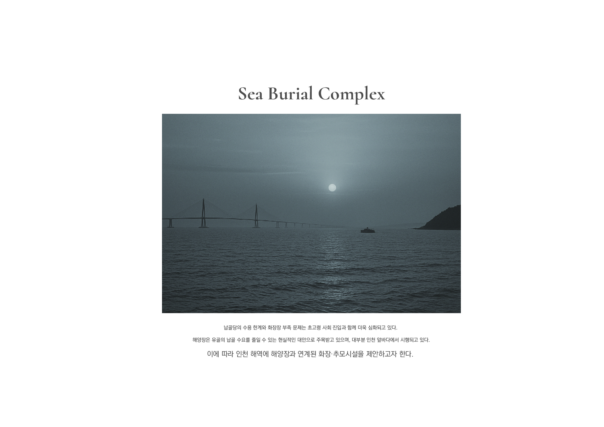 2025년 장사법 개정으로 해양장이 합법화되었으나, 현재 해양장은 추모 공간으로서 한계가 있다. 이에 본 설계는 인천 영종진공원에 고인의 개별성과 장소성을 회복할 수 있는 새로운 형태의 해양 연계 화장 추모 시설을 제안한다.