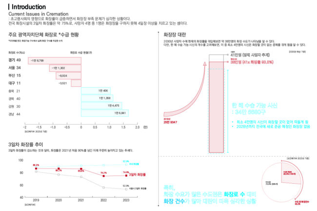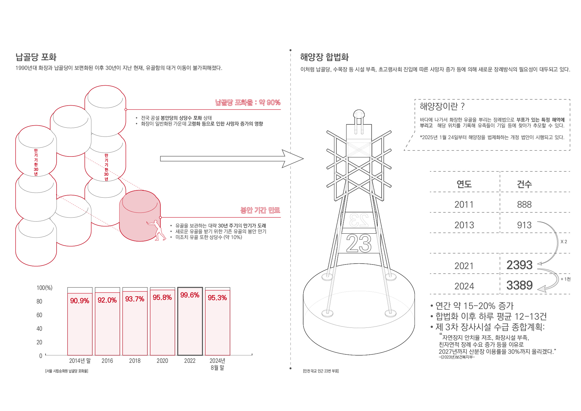 화장의 보편화와 납골 문화의 정착으로 장례 방식이 변화했지만, 초고령 사회로 인해 화장장과 납골당은 수요를 감당하지 못하고 있다. 전국 공설 봉안당은 대부분 90% 이상의 포화율을 보이며, 일부 지역에서는 화장 지연으로 인해 장례 일정이 늘어나는 사례도 빈번하다. 또한 유골 보관 주기인 30년이 도래하면서 대규모 이장 문제도 현실화되고 있다.