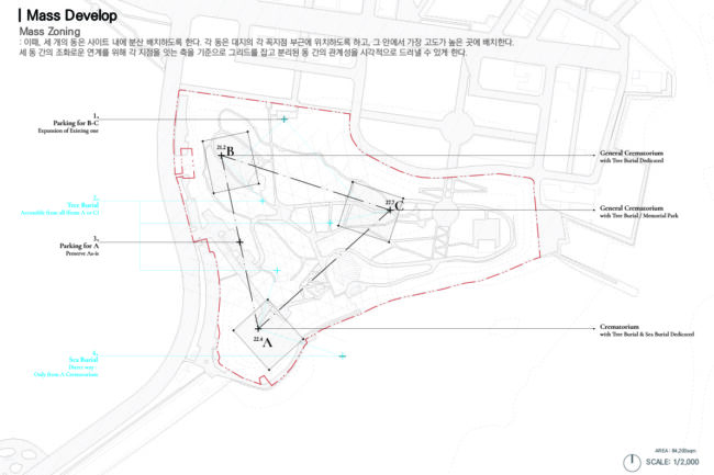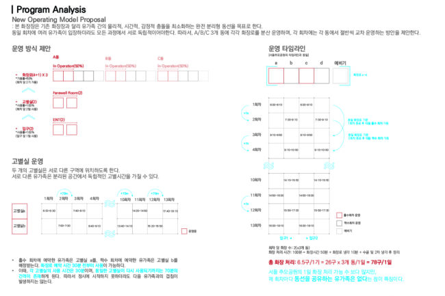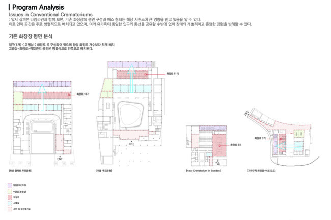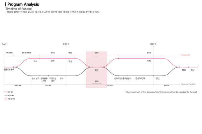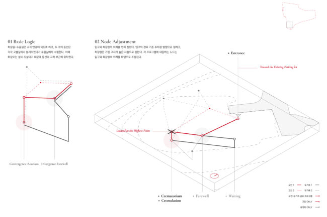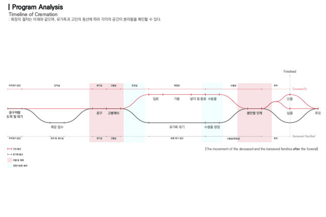 장례와 화장은 절차와 순서가 명확한 시퀀스를 따르는 행위이며, 유가족과 고인은 이에 따라 공간을 순차적으로 이용하게 된다. 본 설계는 이러한 특성을 반영해 동선 중심의 프로그램 배치를 구성하며, 특히 기존 화장장의 문제점인 유가족 간 동선의 겹침을 해소하는 데 중점을 둔다. 각 유가족이 독립적이고 사적인 경로를 따라 이동할 수 있도록 프로그램을 분리하고 동선을 분산하며, 이를 위해 사이트 내에 세 개의 화장동을 분산 배치한다. 각 화장동에는 장례 절차에 따라 필요한 공간들이 독립적으로 구성되어, 유가족이 하나의 흐름 안에서 각 단계를 순차적으로 경험할 수 있도록 한다.
