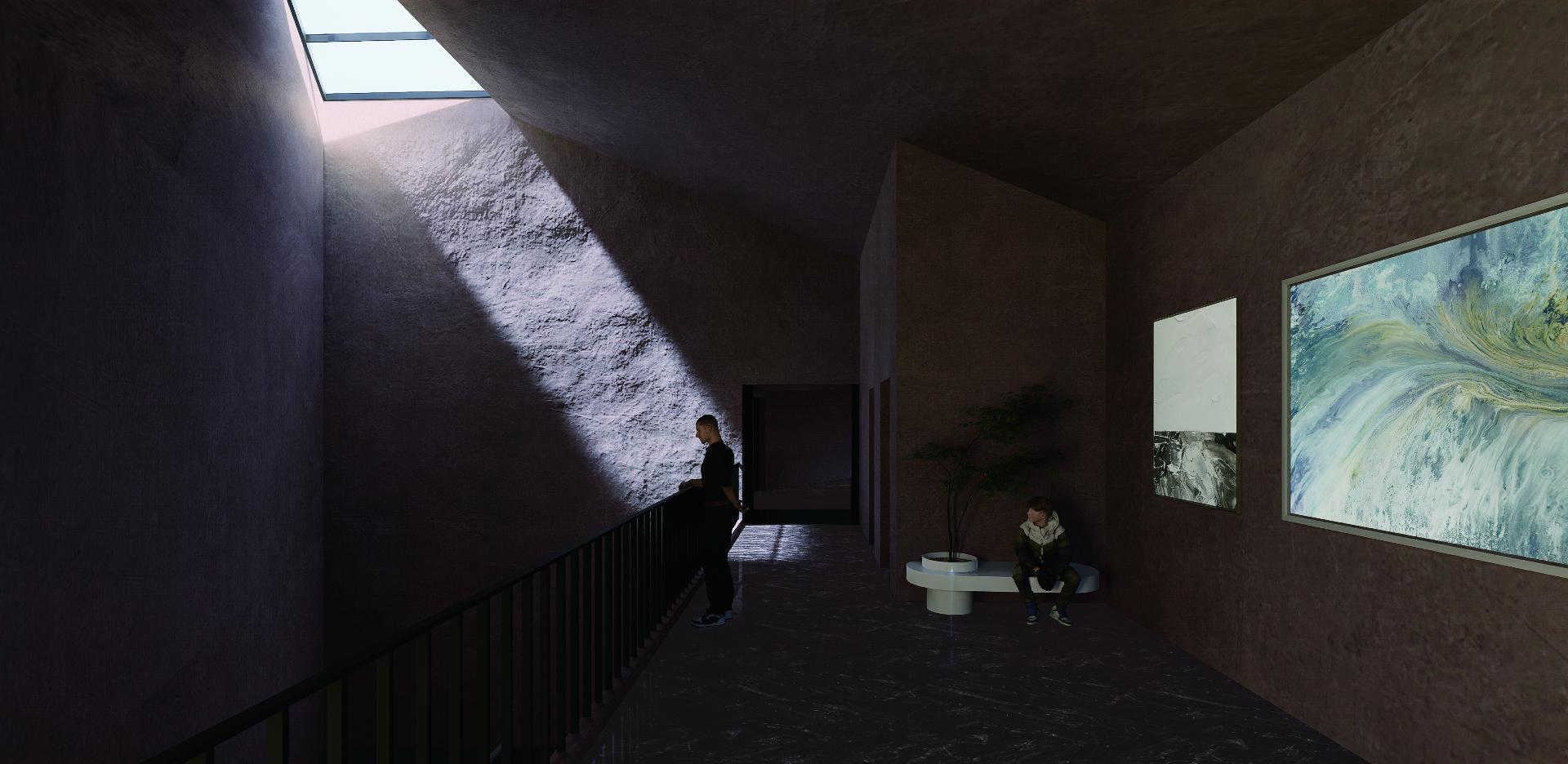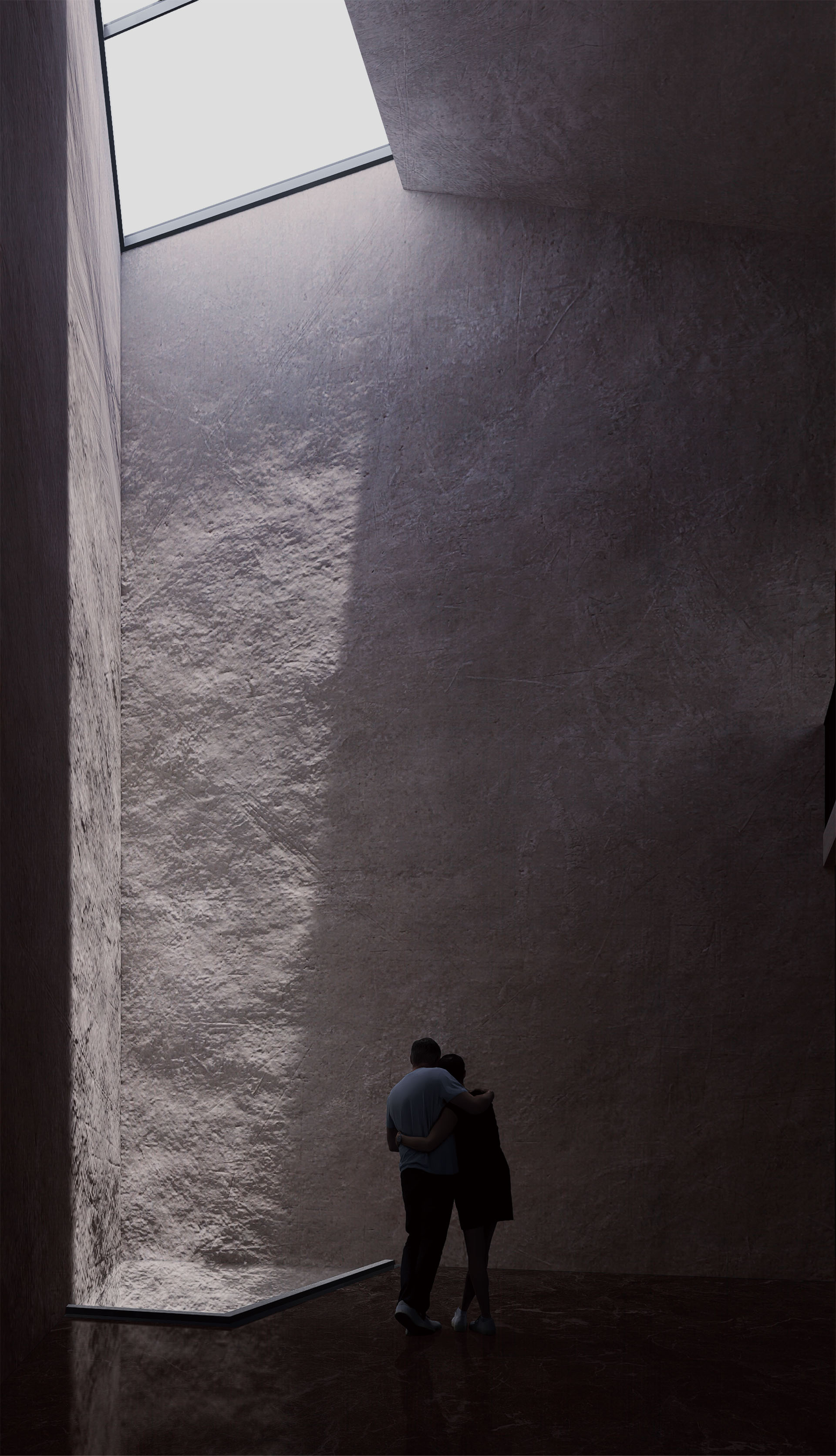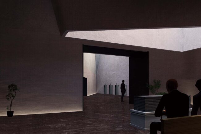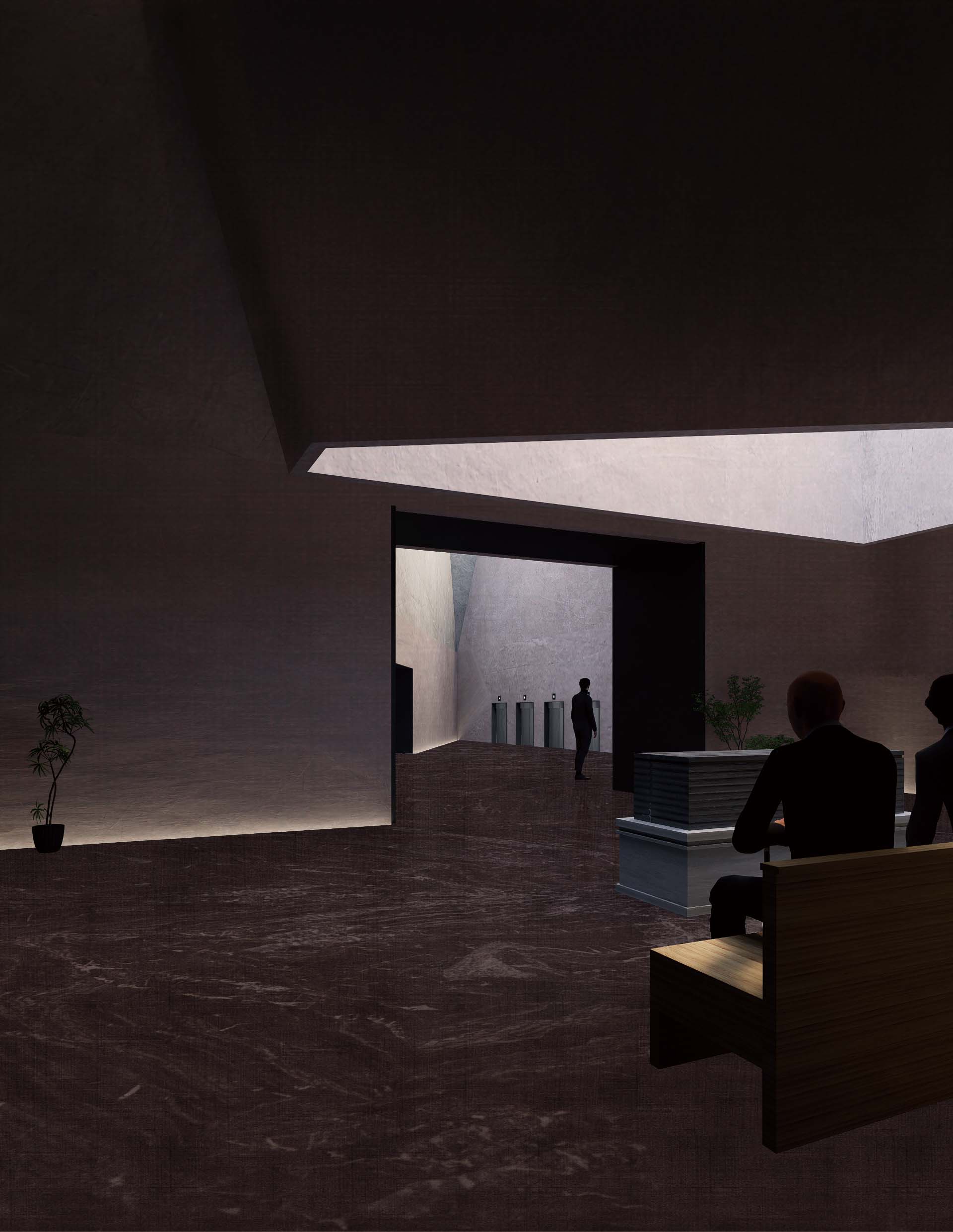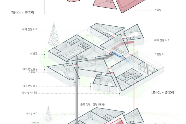 또한, 전체적인 매스는 화장장이라는 정적인 공간에 들어오는 빛을 강조할 수 있도록 고깔 형태로 설정했다.