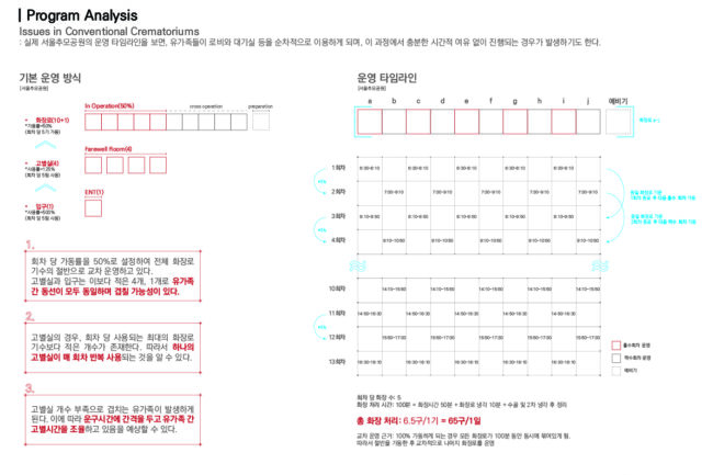 각 화장동은 동시에 두 유가족이 이용할 수 있도록 계획되되, 유가족 간 동선이 물리적으로 겹치지 않도록 입구부터 대기실과 고별실, 화장로, 수골실에 이르기까지 분리된 경로를 따른다. 특히, 본격적인 대기실은 고별실보다 한 층 아래에 배치되는 등, 다음 유가족의 고별 절차와 시각·청각적 간섭 없이 대기할 수 있도록 계획하였다. 이러한 수직 분리는 시퀀스의 연속성을 유지하면서도 절차 간의 공간적 독립성을 강화하는 장치로 기능하며, 모든 유가족이 각자의 흐름 안에서 차분한 분위기 속에 의식을 치를 수 있도록 돕는다.