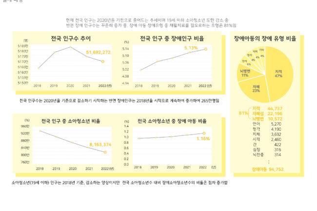 현재 전국 인구는 2020년을 기점으로 감소하기 시작했지만, 장애인구는 2018년부터 꾸준히 증가하여 현재 265만 명에 이릅니다. 또한, 전국 소아청소년(19세 이하) 인구는 2018년 기준으로 감소하고 있지만, 전체 소아청소년 인구 대비 장애 소아청소년의 비율은 점차 증가하고 있습니다. 장애 아동의 유형을 살펴보면, 지적, 자폐성, 뇌병변 등 전체의 81%가 재활치료를 필요로 하는 유형임을 알 수 있습니다.