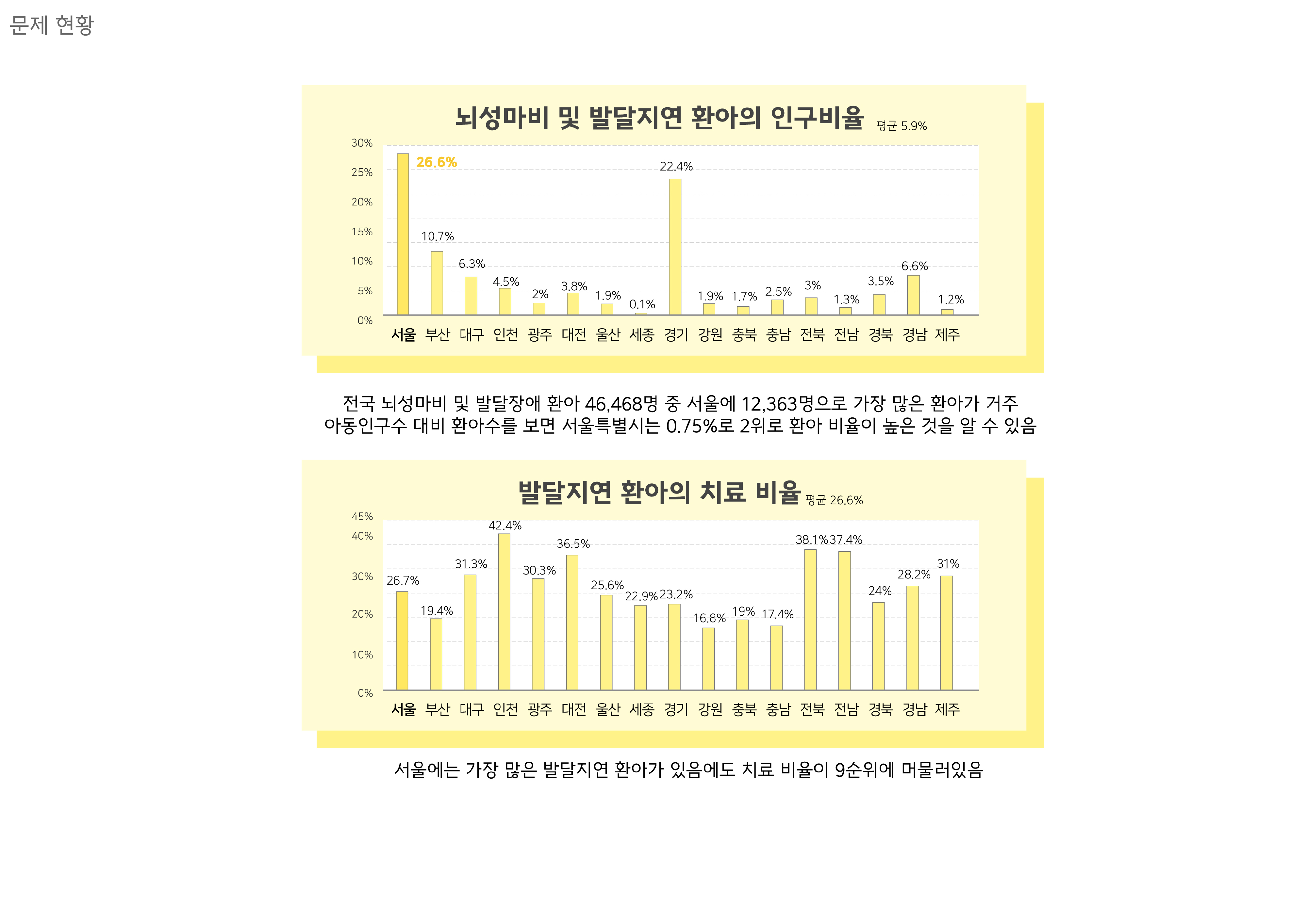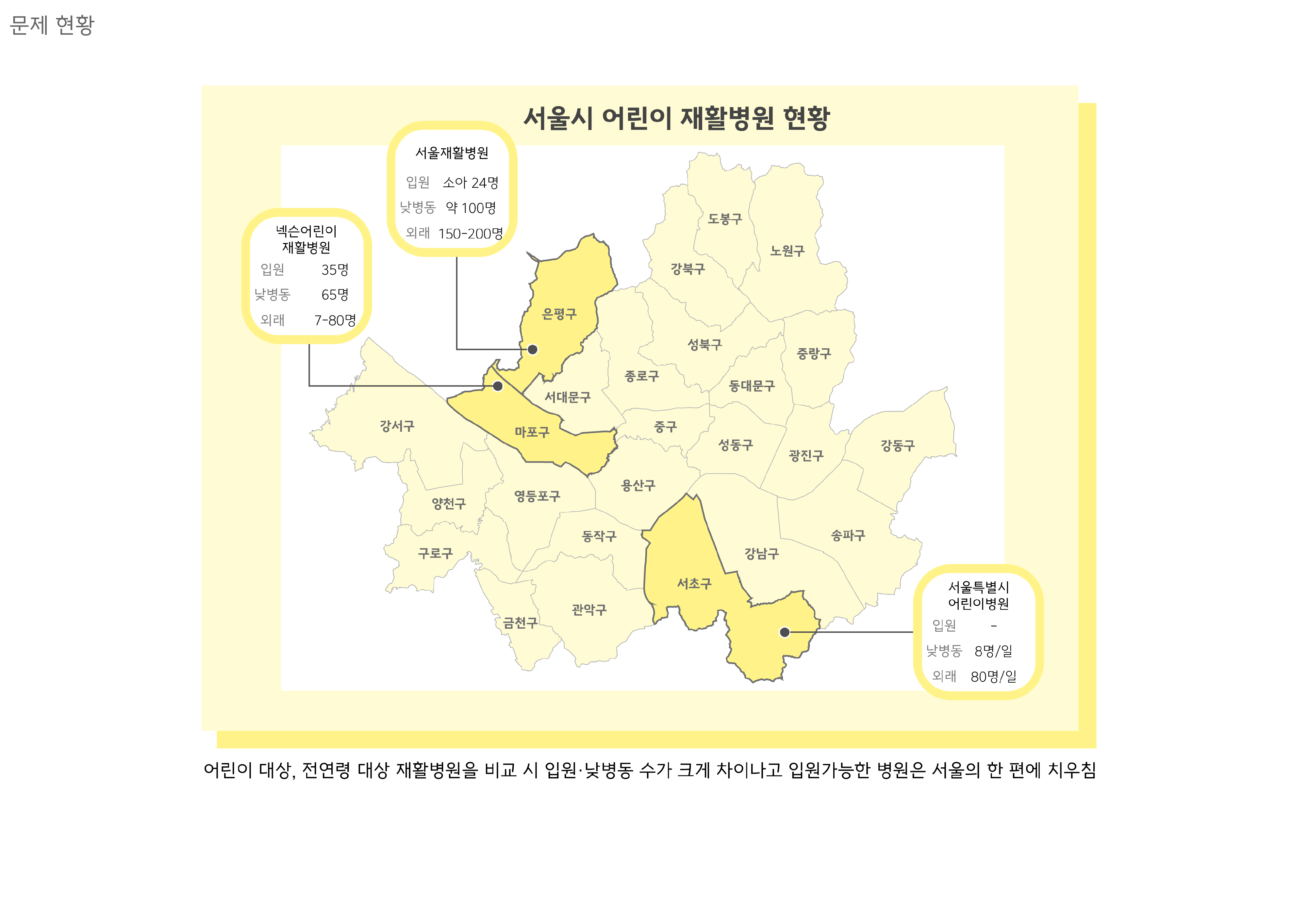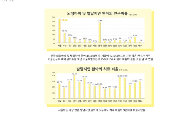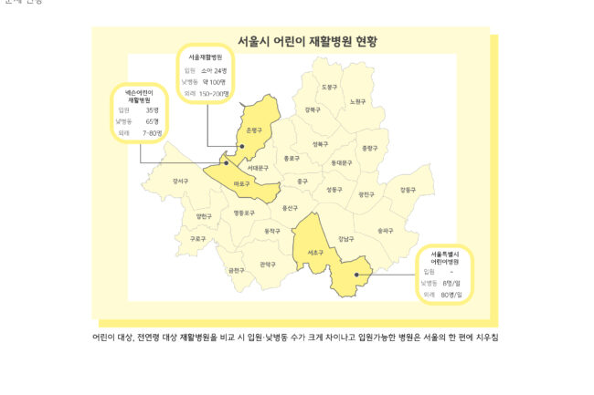 이러한 발달지연 장애를 가진 아동들은 주로 서울과 경기 지역에 거주하고 있습니다. 그러나 그래프에서 확인할 수 있듯이, 서울에 거주하는 발달지연 장애아동의 치료비율은 9위에 불과합니다. 이는 서울 내 재활병원의 현황과 관련이 있습니다. 어린이가 이용할 수 있는 재활병원의 수가 충분하지 않으며, 입원이 가능한 병원도 서울의 서북권에 집중되어 있어 대부분의 지역에서 접근이 어려운 상황입니다.