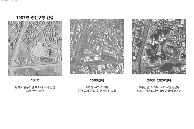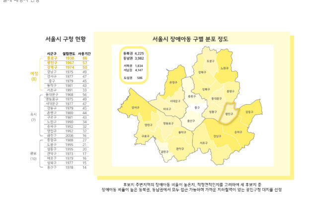 공공성을 지닌 대지로는 지역 주민들을 지원하는 구청의 대지가 적합합니다. 최근 구청들은 역세권이나 주거지역과 가까운 신청사로 이전하는 추세이므로, 이전 후 남는 대지를 활용할 수 있는 곳을 후보지로 고려하였습니다. 다음으로 서울에서 장애 아동이 많이 거주하는 지역을 조사한 결과, 동북권과 동남권에 많은 비율로 거주하고 있음을 확인했습니다. 후보지 중 광진구청의 대지는 동북권과 동남권 모두에 접근이 가능한 중심에 위치해 있으며, 가까운 지하철역과 버스 정류장이 있어 접근성이 뛰어나기 때문에 광진구청의 대지를 설계 대상지로 선정하였습니다.