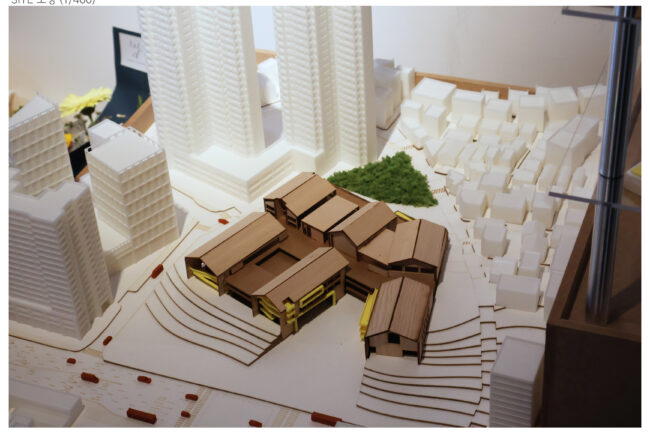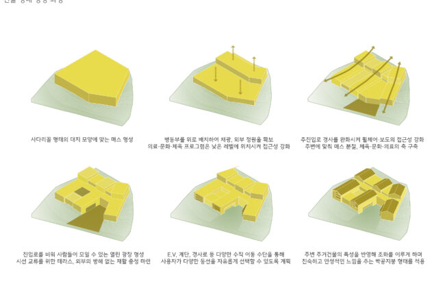 – 주변 건물 스케일에 맞춰 체육, 문화, 의료 기능으로 건물 분절.