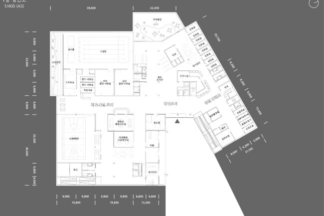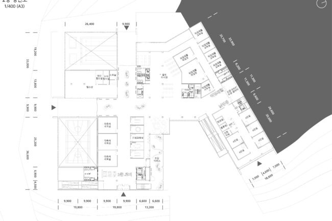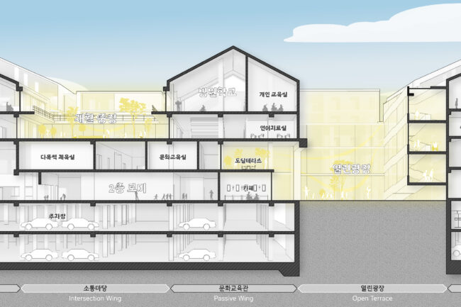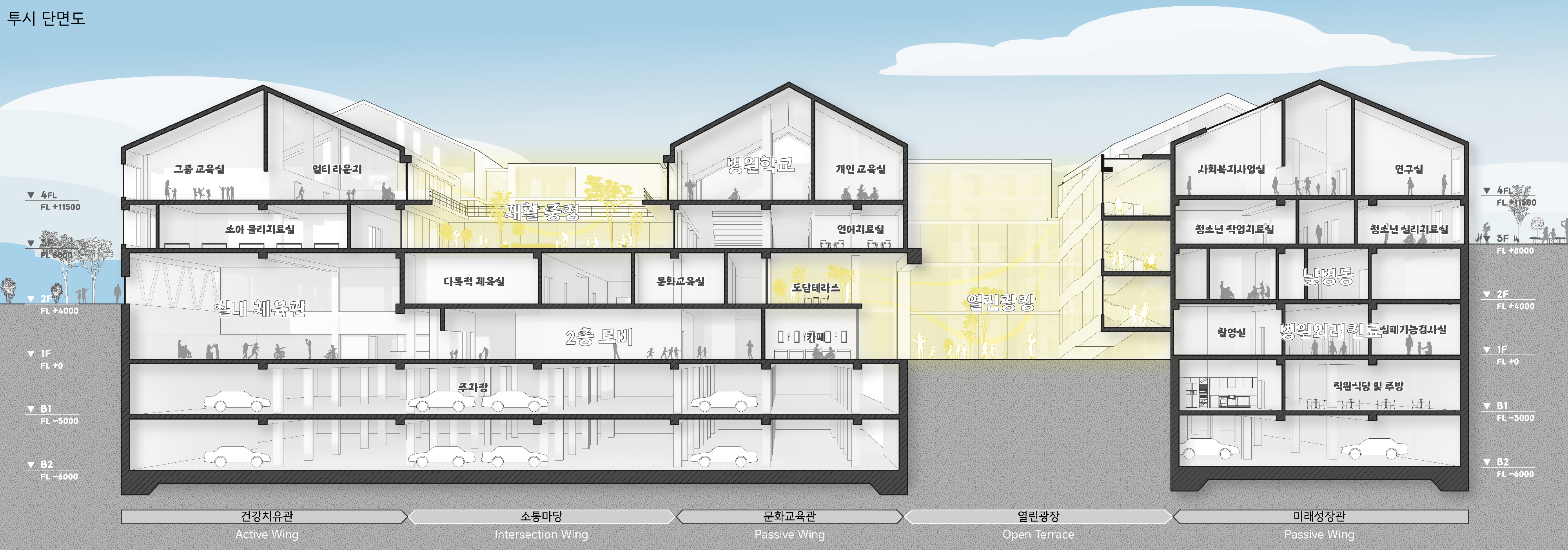 경사로 인한 레벨 차이를 고려해 체육시설은 2개층으로 계획하여 채광과 환기가 가능하도록 했으며, 지하광장(선큰)을 통해 도서관과 병원 대기공간의 채광 및 환기를 제공함. 또한, 휴식과 놀이 공간도 마련함.