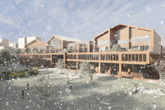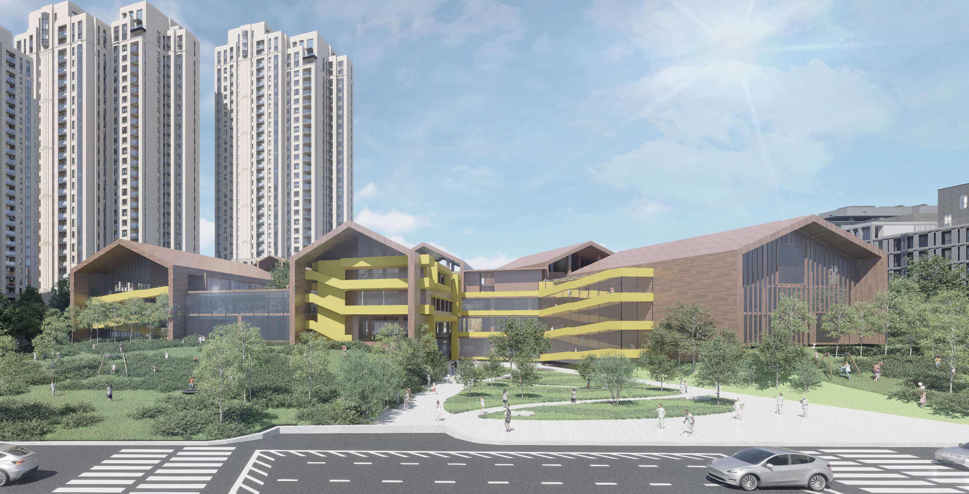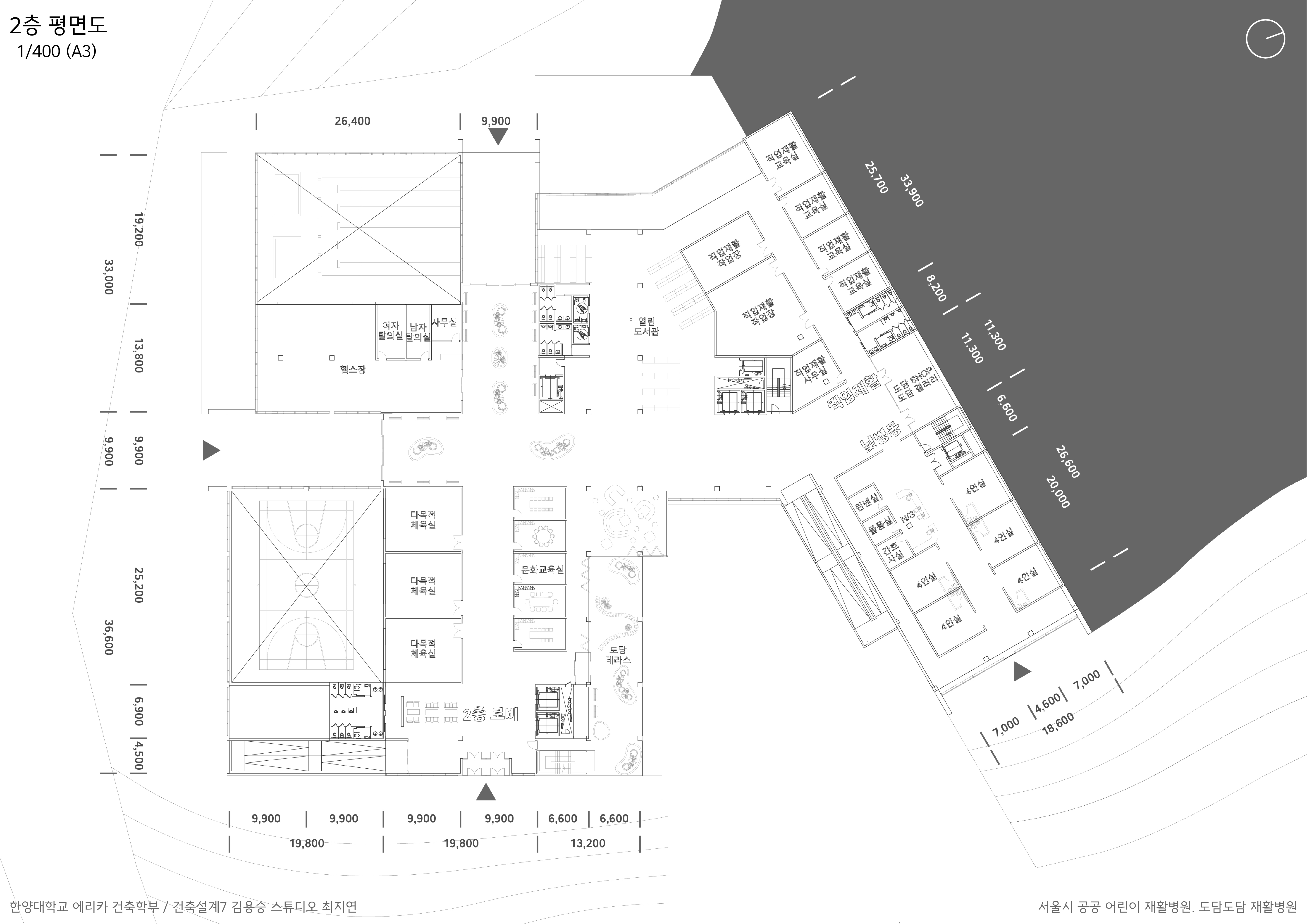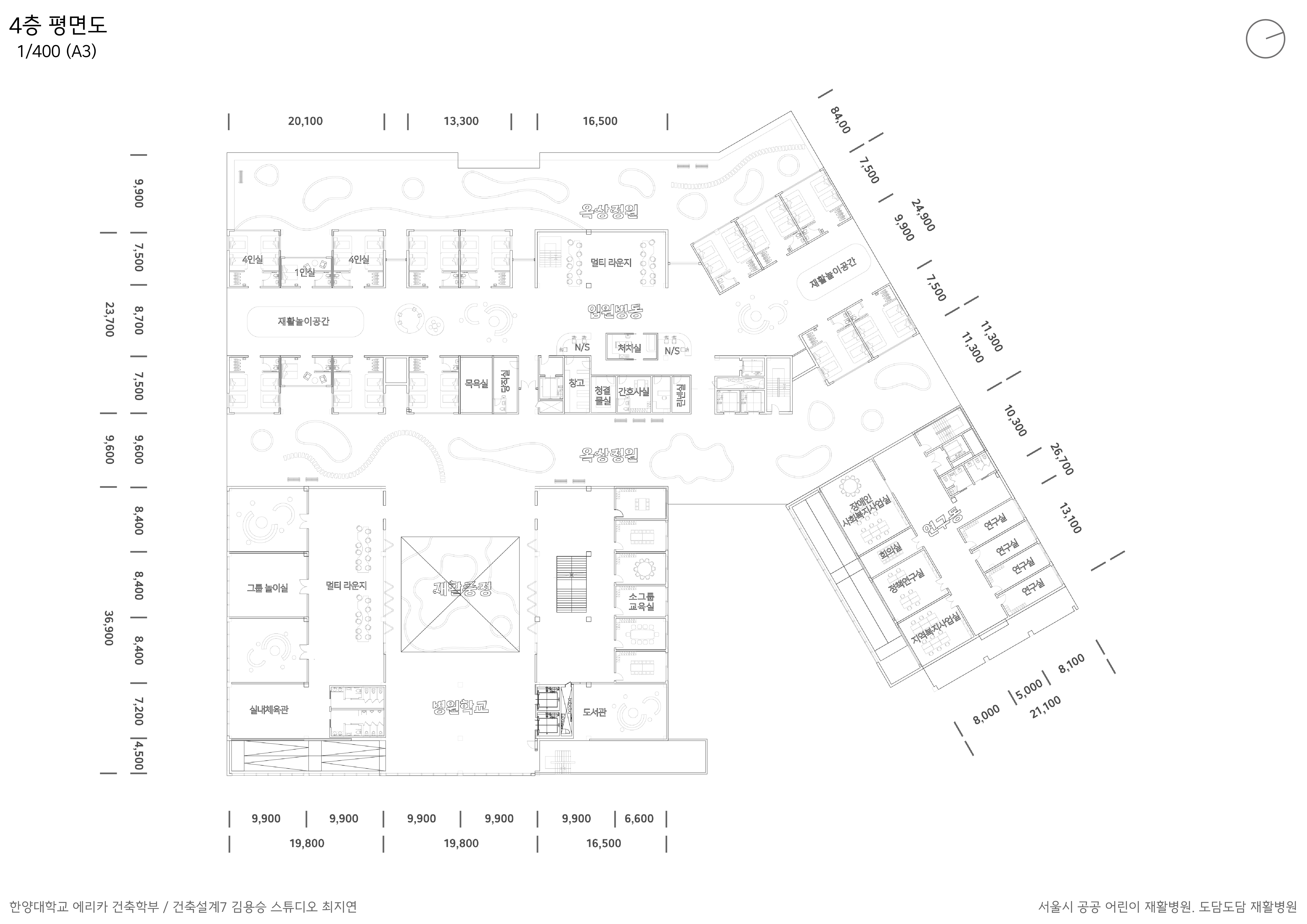 입원한 아동이 교육을 들을 수 있는 병원 학교를 계획함. 큰 활동 교육 교실은 좌측에, 소규모 개인 교육실은 우측에 배치함. 외부 공원에서는 휴식과 야외수업이 진행될 수 있음.
