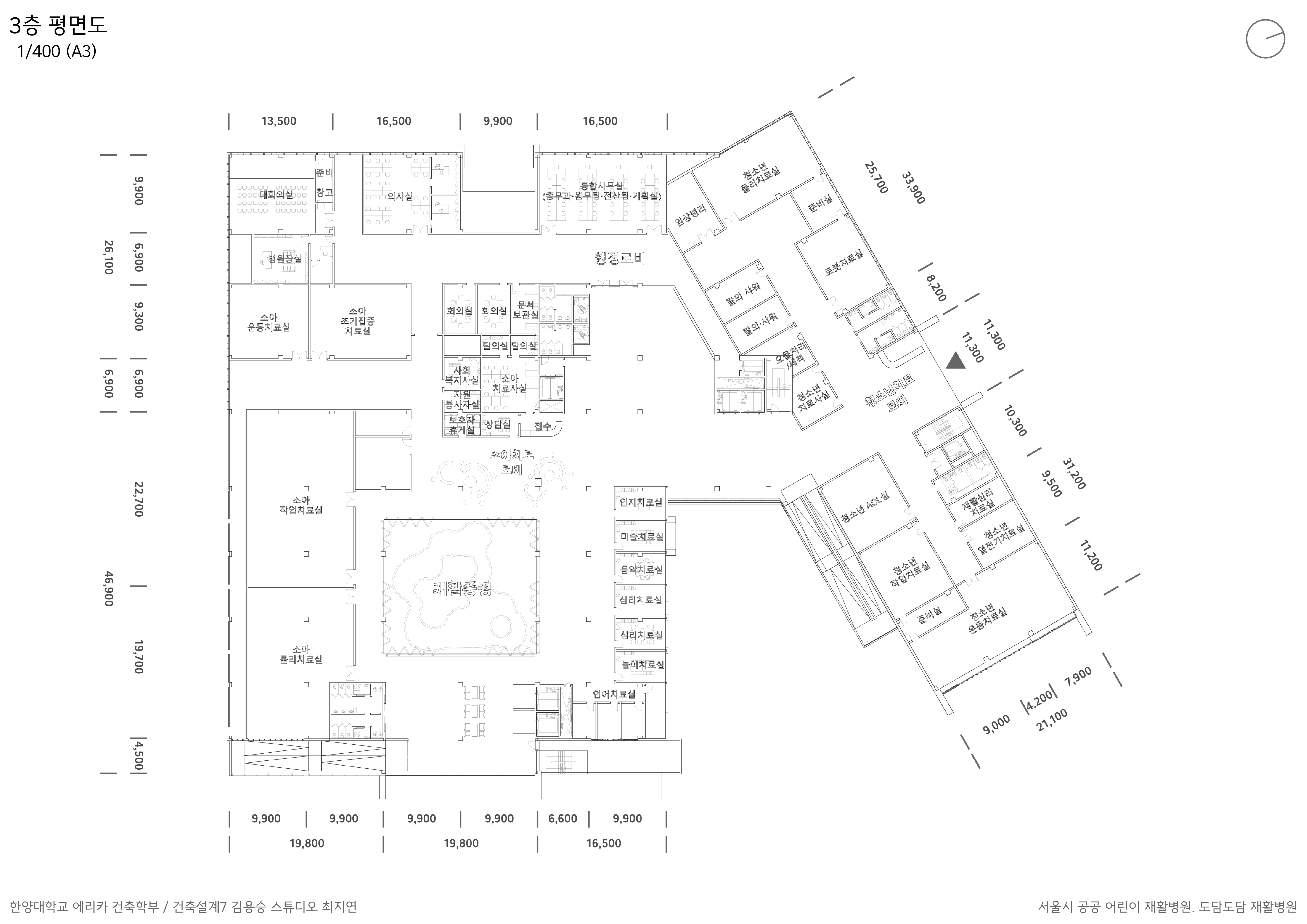 재활 중정을 기준으로 물리 치료실은 좌측에, 심리 및 인지 치료실은 우측에 위치시켜 중정이 다양한 프로그램을 융화시키는 역할을 함. 치료 후 쉬는 시간에는 병동으로 올라가지 않고도 중정에서 휴식을 취하며 다른 환아들과 친목을 다질 수 있도록 계획함.