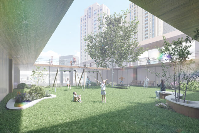 병동부 건물들은 소공원을 중심으로 주거지역과 마주보고 있음. 병동부의 외부 정원에서 소공원을 바라볼 수도 있고, 소공원에서 직접 지역 아동들과 입원 환아들은 서로 만나 놀이를 통해 친밀감을 쌓을 수 있음.
