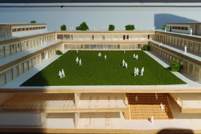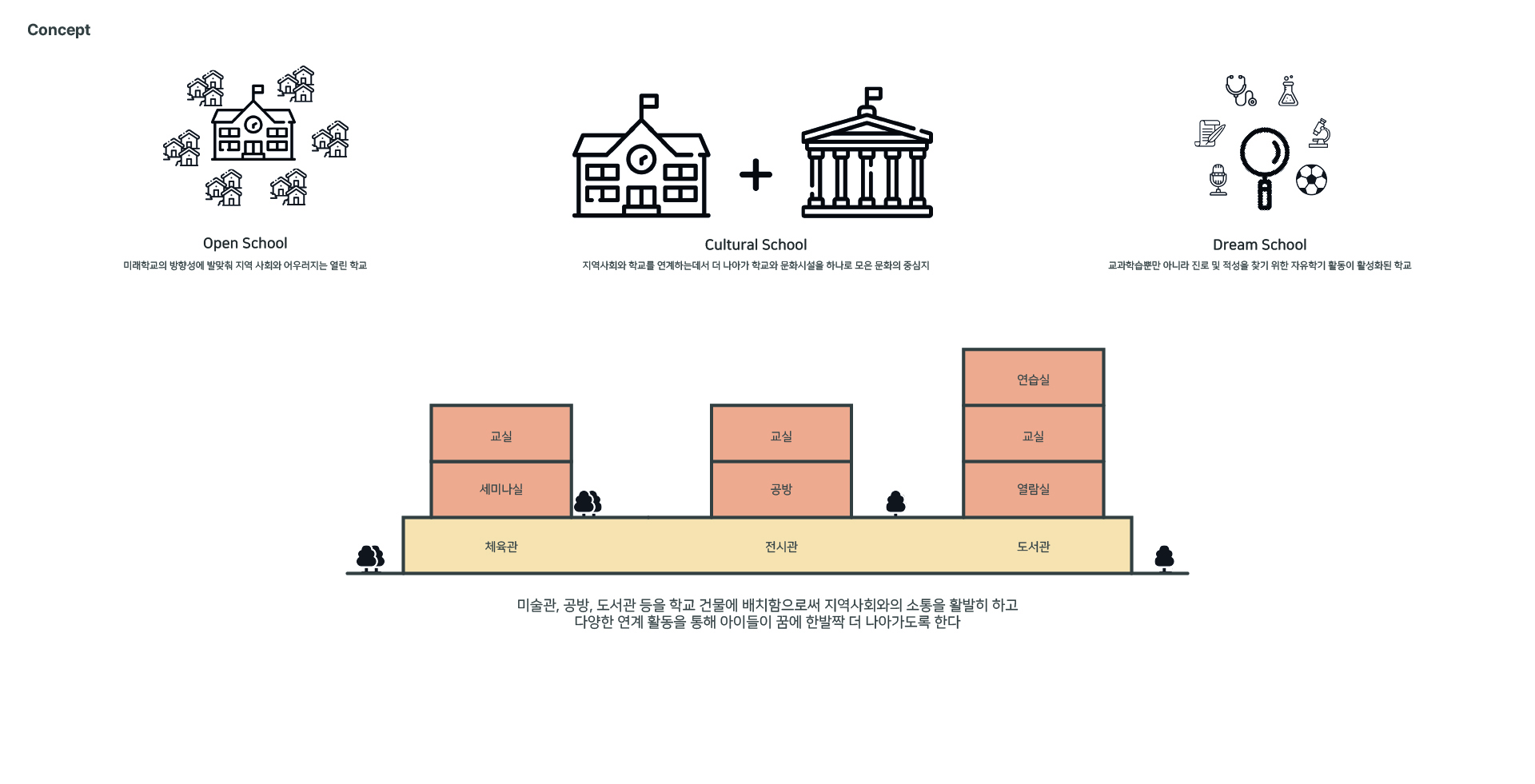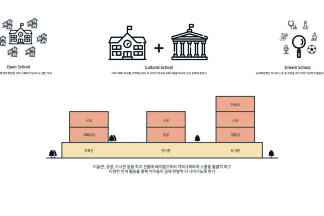 기존의 학교는 약 100년간 획일화된 형태로 지어지고 있었다. 딱딱한 학교의 구성은 감시에 편리하게 만들어져 마치 교도소와 같은 모습을 하고 있었기 때문에 그런 구조에서 벗어나 학생과 지역사회를 위한 학교를 만들고자 했다.