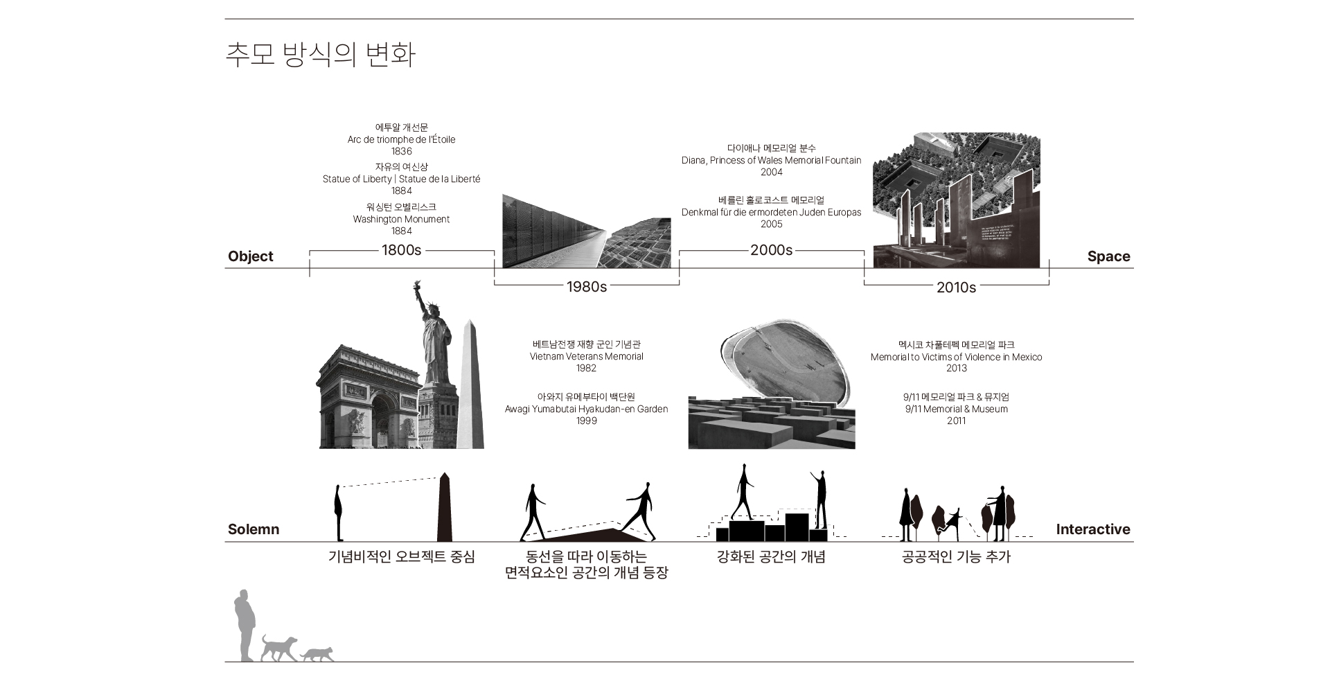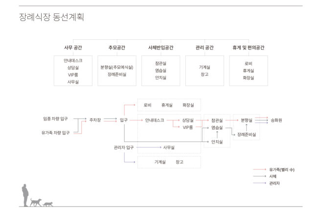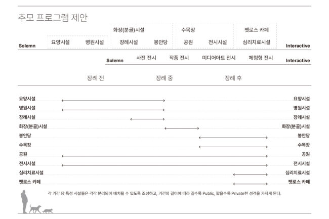 변화하고 있는 추모 방식을 고려하여 기념비적인 오브젝트 중심의 추모 공간이 아닌 동선을 따라 이동하는 공간의 개념에 공공적인 기능이 주가 되는 공간을 구성하고자, 일련의 시퀀스를 경험할 수 있는 선형의 언덕진 공간을 부지로 선정하였다._ 반려동물이 무지개다리를 건너는 순간의 프로그램인 장례식장, 화장장, 봉안당 뿐만 아니라, 죽음 전의 프로그램인 요양원, 놀이터, 미용실, 동물병원과 죽음 후의 프로그램인 추모공간인 전시관, 심리치료센터, 펫로스카페의 시설들을 각각의 구역으로 나누어 배치하고, 서로 간의 공간을 차폐시킴으로서 각 시설을 경험하러 온 사람들의 목적에 맞도록 동선을 구분하였다.