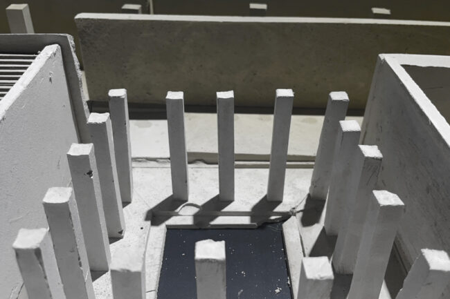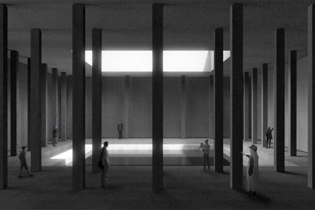 ‘보이지 않는 기념관’은 눈에 보이는 구조물보다 공간이 만들어내는 감각과 경험에 집중하는 비가시적 건축입니다. 이곳에서 건축은 상징적 조형물이 아니라, 감정의 흐름과 내면의 각성을 유도하는 장치로 작동합니다. 방문자는 창열문에서 시작해 ‘기억의 문턱’, ‘메모리얼 홀’, ‘기억의 서가’, ‘침묵의 방’, ‘빛의 회랑’, ‘무명의 별하늘’, 그리고 전시공간으로 이어지는 순례적 동선을 따라 걷습니다. 이 여정은 점차 변화하는 조도, 음향, 재질, 지형의 흐름 속에서 외부의 일상에서 내면의 사유로 깊어지는 경험을 제공합니다. 기억은 여기서 전시물에 의존하지 않고, 빛과 그림자, 물과 소리, 시간의 변화 속에서 체험으로 새겨집니다. 그 결과, 방문자는 단순한 관람자가 아니라 과거의 정신을 계승하는 주체로 전환되며, 대지 전체가 하나의 살아있는 기념관이 됩니다.