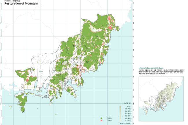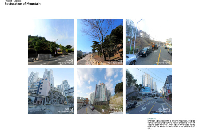 많은 지형이 산으로 이루어진 부산 지역에서는 지난 10년간 수 많은 산에 대한 개발이 이루어졌다. 이로 인해 부산 지역은 넓은 면적의 산과 녹지를 잃었다. 이처럼 산에 대한 개발이 이루어질 때, 대부분의 산이 가지고 있던 고유의 형태가 모두 사라지게 되고, 고층 빌딩 및 아파트 등이 대지를 소유하게 되어 산을 점유하게 된다. 자연 녹지를 제공해주는 산에 대한 무분별한 개발보다는 고유의 가치와 지형을 유지하며 개발하여, 자연 및 지역사회와 잘 어우러지는 제안이 이루어져야 한다.