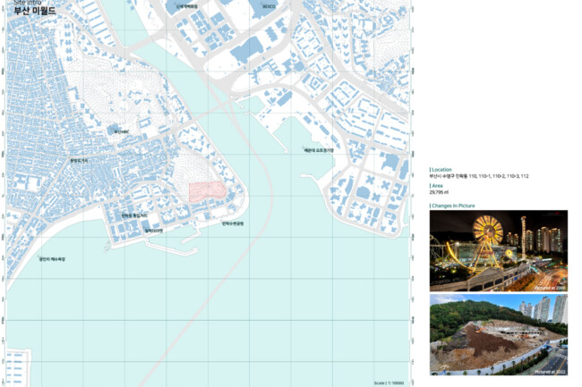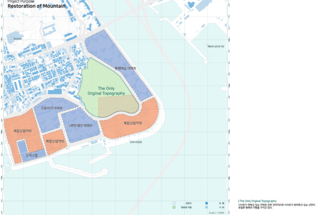 사이트는 민락수변공원을 변하고 있는 산에 위치하고 있는데, 이 수변 지역은 과거 매립되어 생겨난 간척지이다. 진조말’산’을 제외하면 모두 인위적으로 생겨난 지역이며, 오직 산만이 자연적으로 생겨난 ‘원래의 지형’을 유지하고 있다. 따라서 현재 훼손된 산을 다시 녹지로 돌려주며 복합문화시설로서 개발하여 주변 관광지와 연결시키고자 한다.
