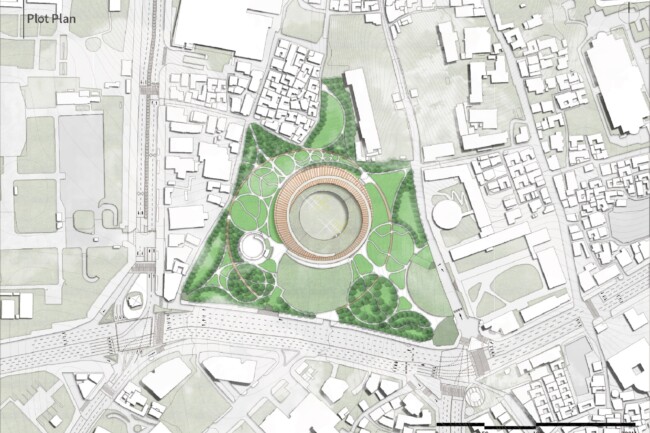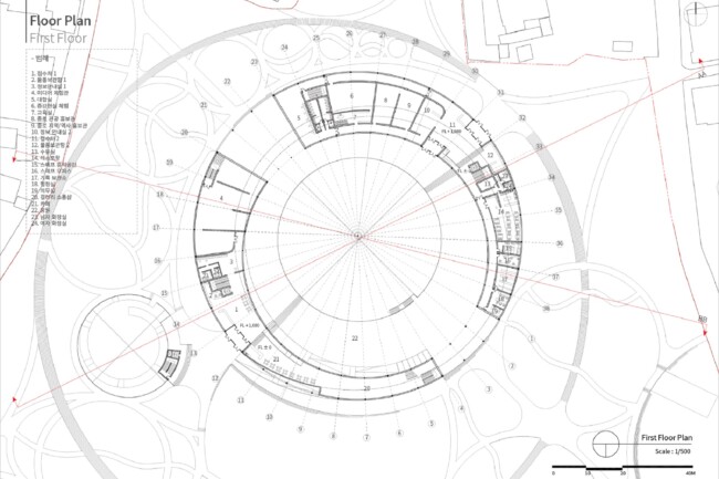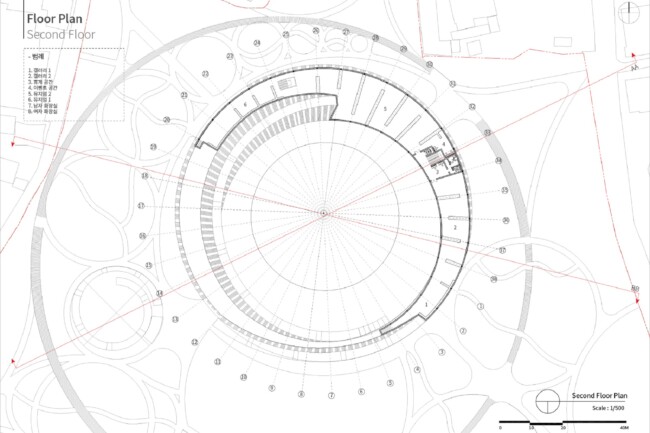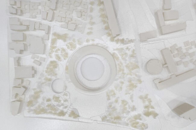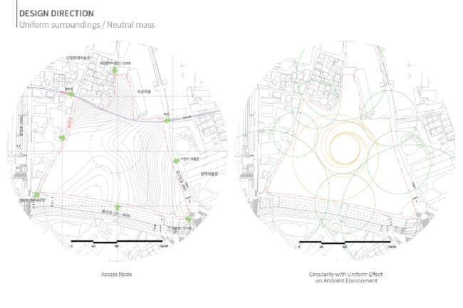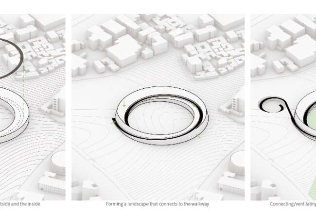 대로변의 거대 녹지라는 더 넓은 맥락에서 모든 방향에서 주변 환경에 균일한 영향을 미치며 너무 중심적이지 않은 느낌을 주고자 사이트 중앙에 원형 링의 매스를 위치시켰다.
