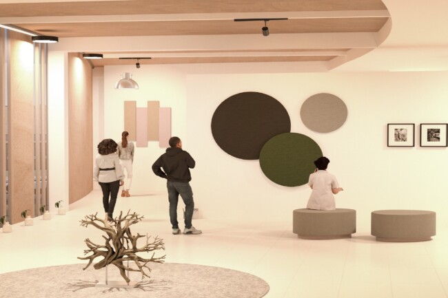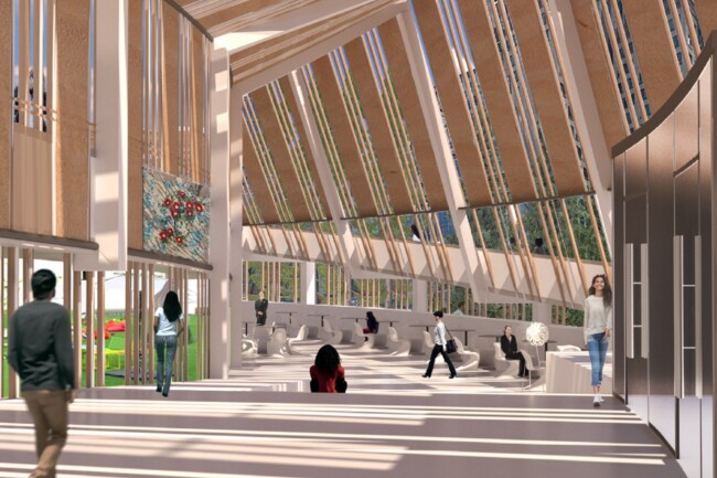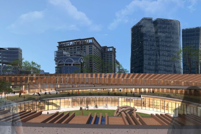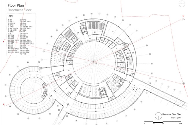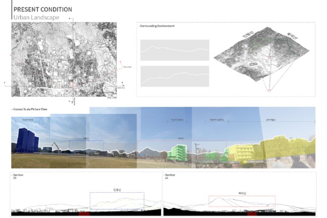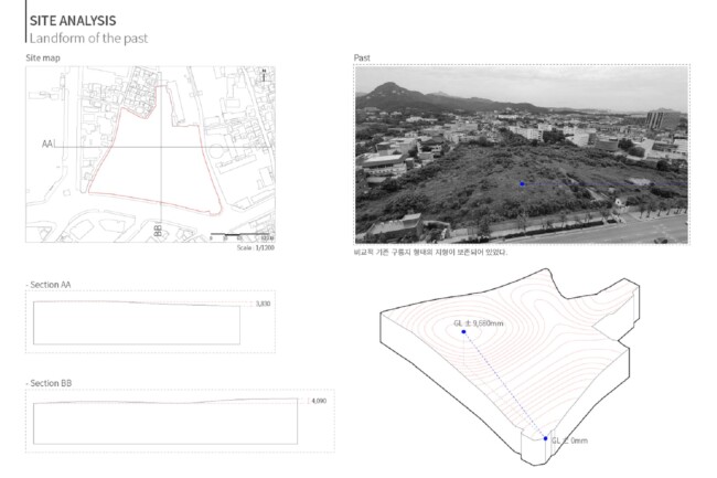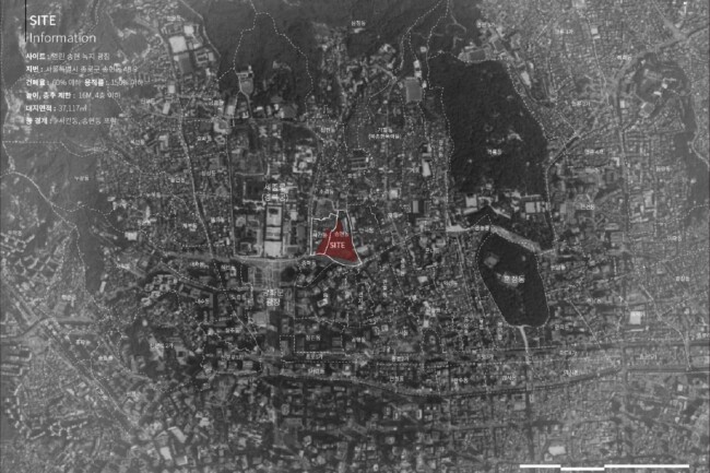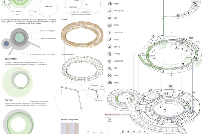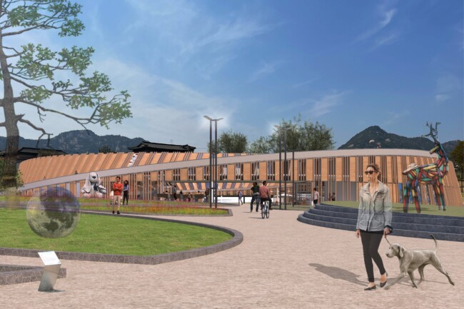 과거 소나무 언덕을 표상하는 방식으로 외부 조경은 소나무를 이용하고, 목재루버와 목재패널, 유리의 패턴 있는 입면을 가진 매스는 지속적으로 중립적인 형태의 환영을 만들어 환경과 자연스럽게 어우러지고, 다른 한편으로 이 추상적인 볼륨은 매스에 대한 액세스 영역을 자연스럽게 만들어주어 컴팩트하게 느껴짐과 동시에 유동적인 지역의 역동적인 장이 될 것이다.