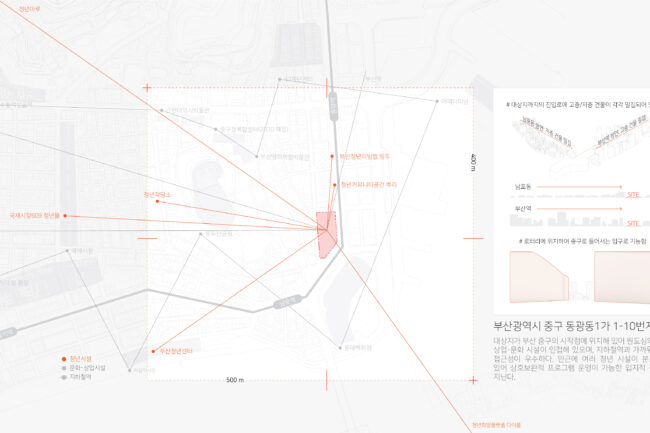 부산은 청년층의 유출이 심화되고 있는 도시 중 하나로, 특히 원도심인 중구는 청년 인구의 밀도가 낮고 정주 기반이 매우 부족한 실정이다. 청년 주거시설이나 공유 기반의 생활 인프라가 부족하여 청년들이 지역 내에서 머무를 수 있는 구조적인 기반이 마련되어 있지 않다. 이로 인해 청년들은 도시에서 지속적으로 살아갈 이유를 찾기 어렵고, 장기적인 정주에 대한 기대 또한 낮아지고 있다. 이러한 문제 상황을 청년이 머무를 수 있는 생활 인프라와 일상의 흐름을 담는 공간으로 완화하고자 하였다.