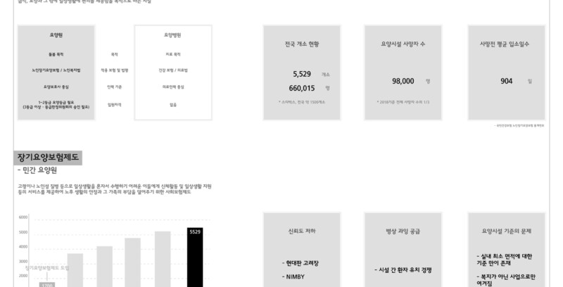 2008년 장기요양보험제도가 생기고 요양시설의 수는 폭발적으로 급증하게 된다. 총 5,529 개소가 있으며 유명 카페 개소의 약 3배 가량 많다. 복지시설로 분류 되어 있는 요양시설이 보험제도 때문에 실버산업의 일부분이 되고 복지의 질이 높아지는 것이 아닌 복지를 가장한 사업이 되었다. 사업성을 갖는 것은 효율성을 따지게 된다. 법적으로 정해진 최소 면적에 최대 인원을 수용한다.