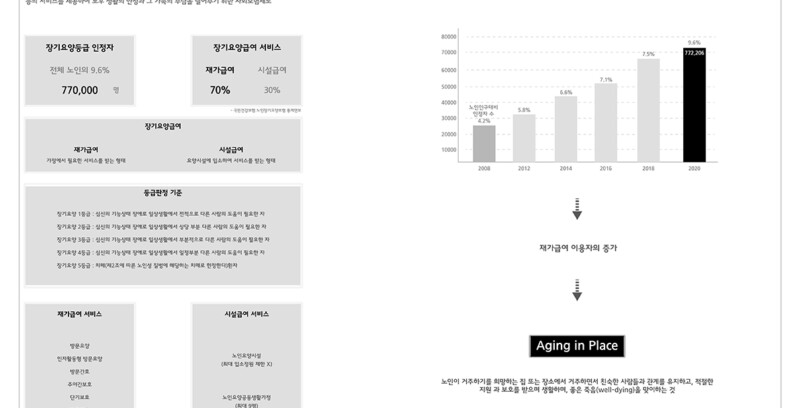 치료를 받아야 할 노인들이 간병인을 둘 수 없는 금전적인 이유로 요양시설을 찾게 되고, 돌봄을 주목적으로 하는 요양시설 속에서 치료를 받아야 할 노인들은 그저 죽음을 기다리는 것 말고는 할 수 있는 게 없는 현실이다. (2018년 기준 65세 이상 사망자 수의 1/3이 요양시설 사망자 수이다)