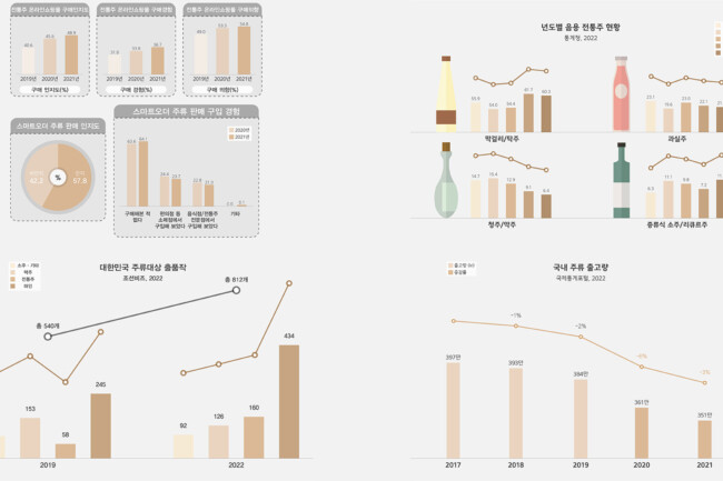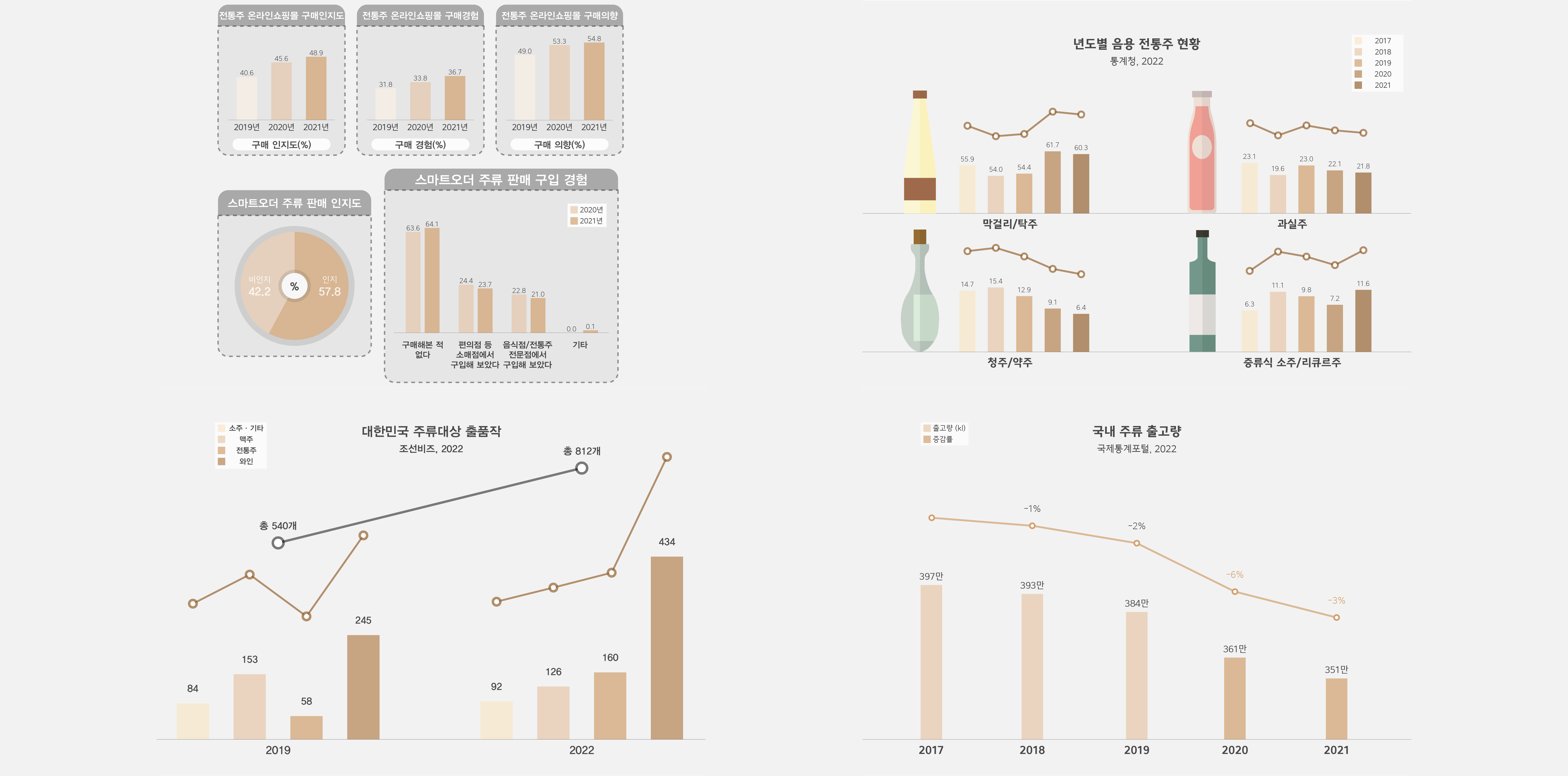코로나 시대 이후, 국내 주류의 출고량은 해가 지날수록 떨어지고 있다. 하지만 이는 국내 주류의 큰 축을 담당하던 맥주와 희석식 소주의 출고량이 하락한 것이 원인이다. 오히려 국내 전통주와 와인의 출고금액은 코로나 이전에 비해 17.9% 이상 증가하였고, 전통주의 비중은 해가 거듭할수록 점점 늘어만 갔다. 이는 코로나로 인해 집에서 주류를 소비하는 사람이 늘어나면서 다양한 주종의 수요가 늘어났고, 자연스럽게 전통주에 대한 관심도가 높아졌기 때문이라고 볼 수 있다. 또한 일반 주류와는 달리 전통주는 통신판매가 가능하기 때문에 사람들이 보다 쉽게 접근해 소비량이 늘어난 것도 원인이라 볼 수 있다.