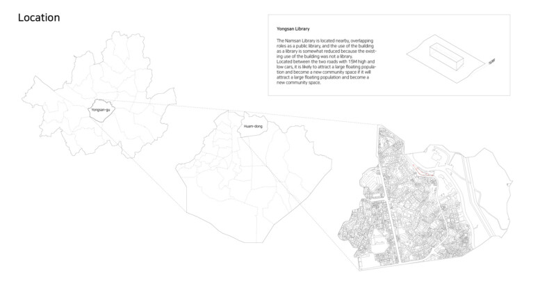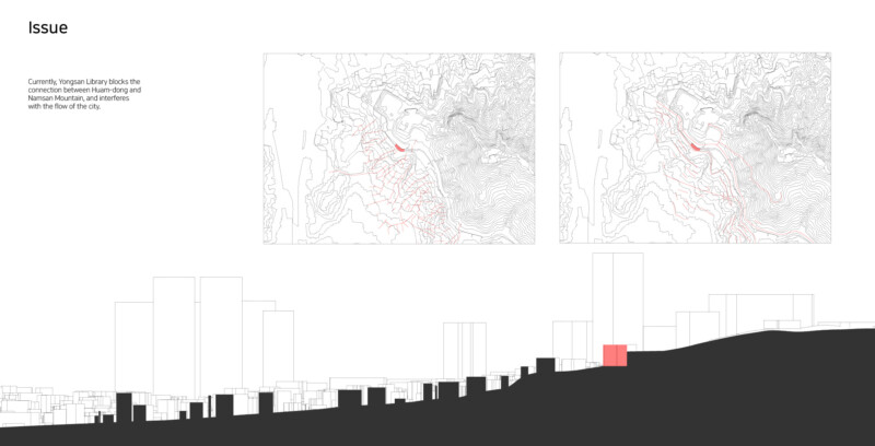현재 용산도서관은 후암동과 남산의 사이에 위치하여 서로 다른 두 지역을 연결할 수 있는 중요한 위치에 있음에도 불구하고 그 흐름을 막아버리고 있다. 또한 15m의 높이차를 갖고 있는 두 도로 사이에 위치하여 위쪽 도로와 아래쪽 도로의 연결 가능성이 높고, 건물이 오래되었을 뿐 아니라 본래 도서관의 용도로 지어진 건물이 아니기에 용산도서관 자리에 새로운 도서관을 짓고자 한다.