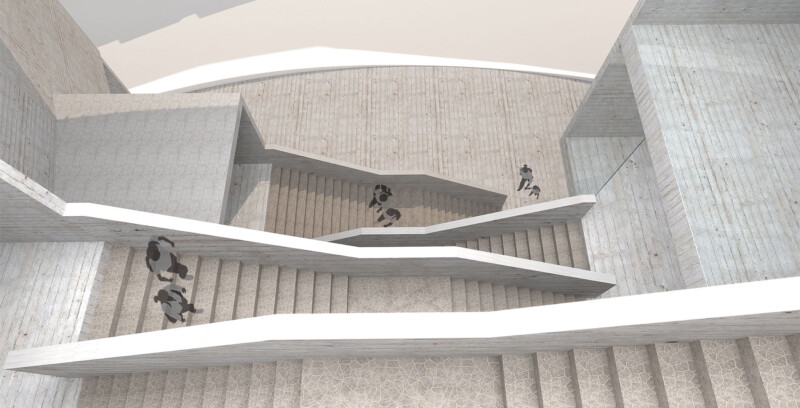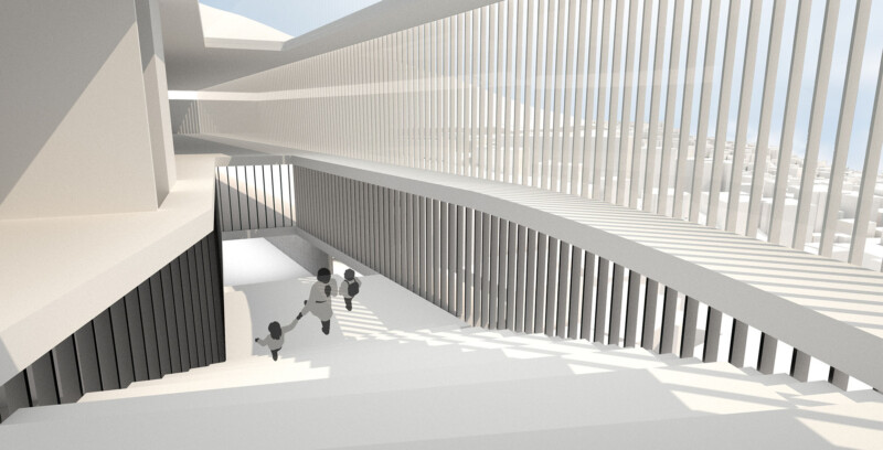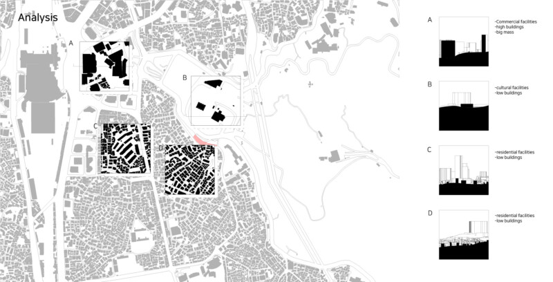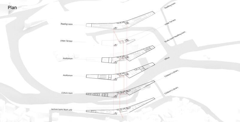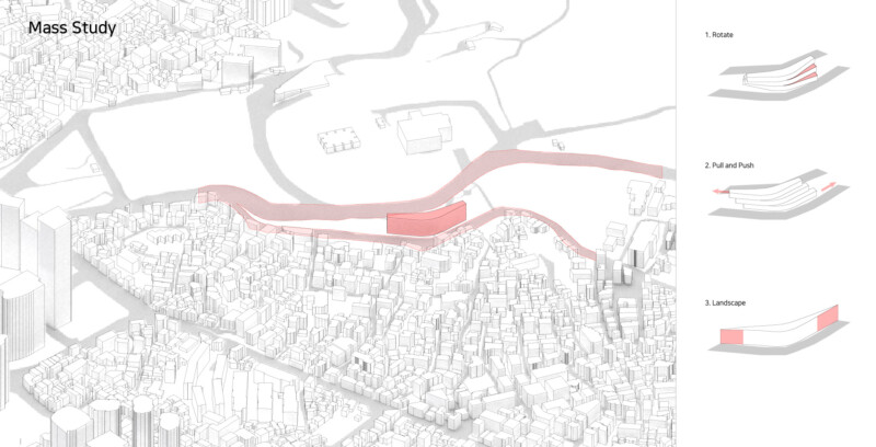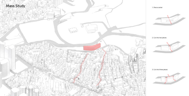 큰 매스 사이에 난 길을 통해 주민들은 남산으로 바로 향할 수 있는 지름길을 얻음과 동시에 질에서 사이의 길에서 자연스럽게 양쪽의 매스로 접근이 가능하게 하고자 하였다. 또한 6층 열람실과 4층 열람실 사이에 위치한 Urban terrace가 주민들의 새로운 쉼터이자 놀이터가 될 수 있도록 하고자 하였다.
