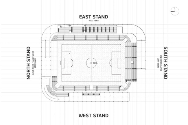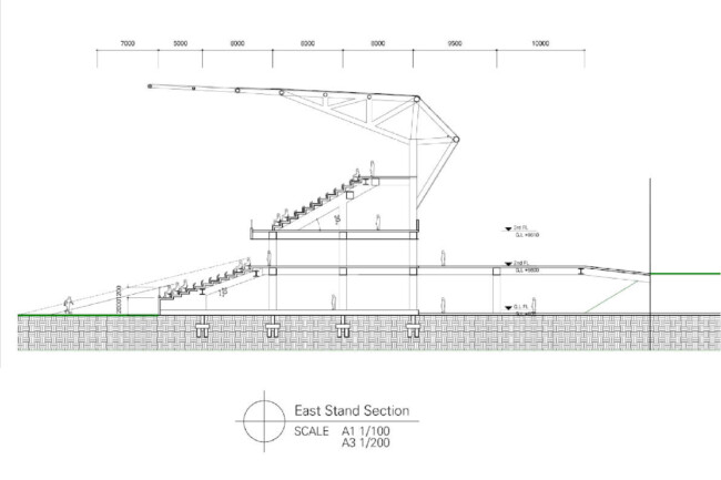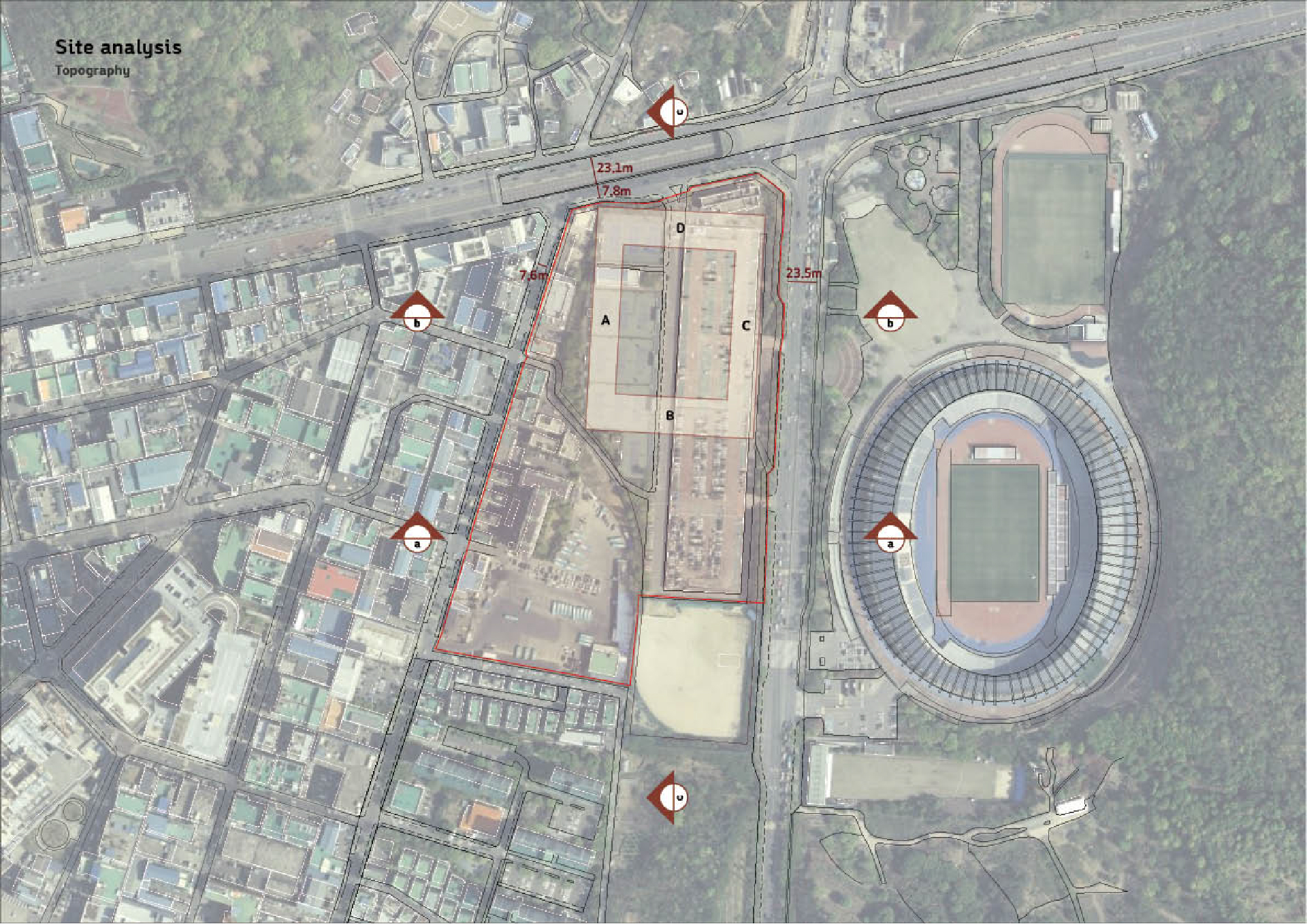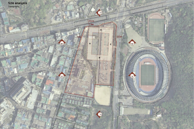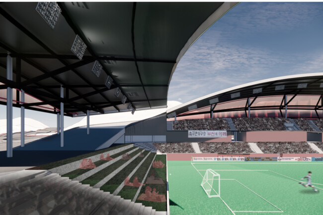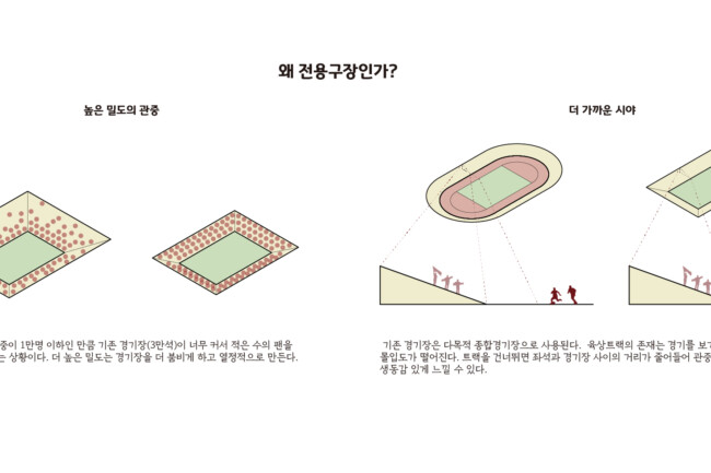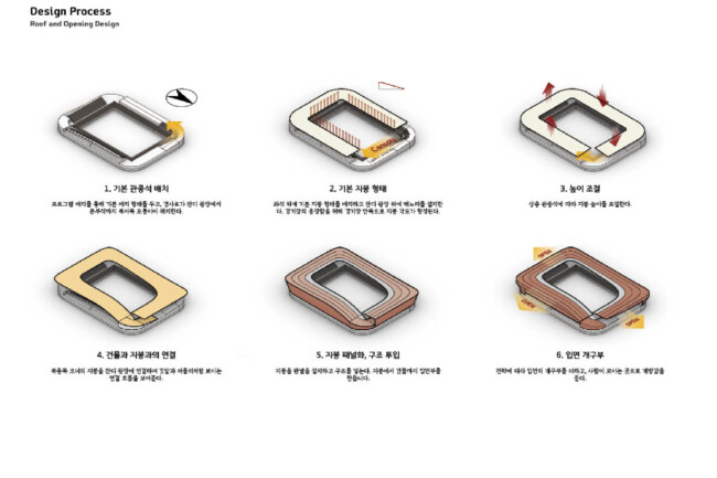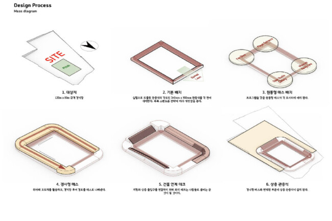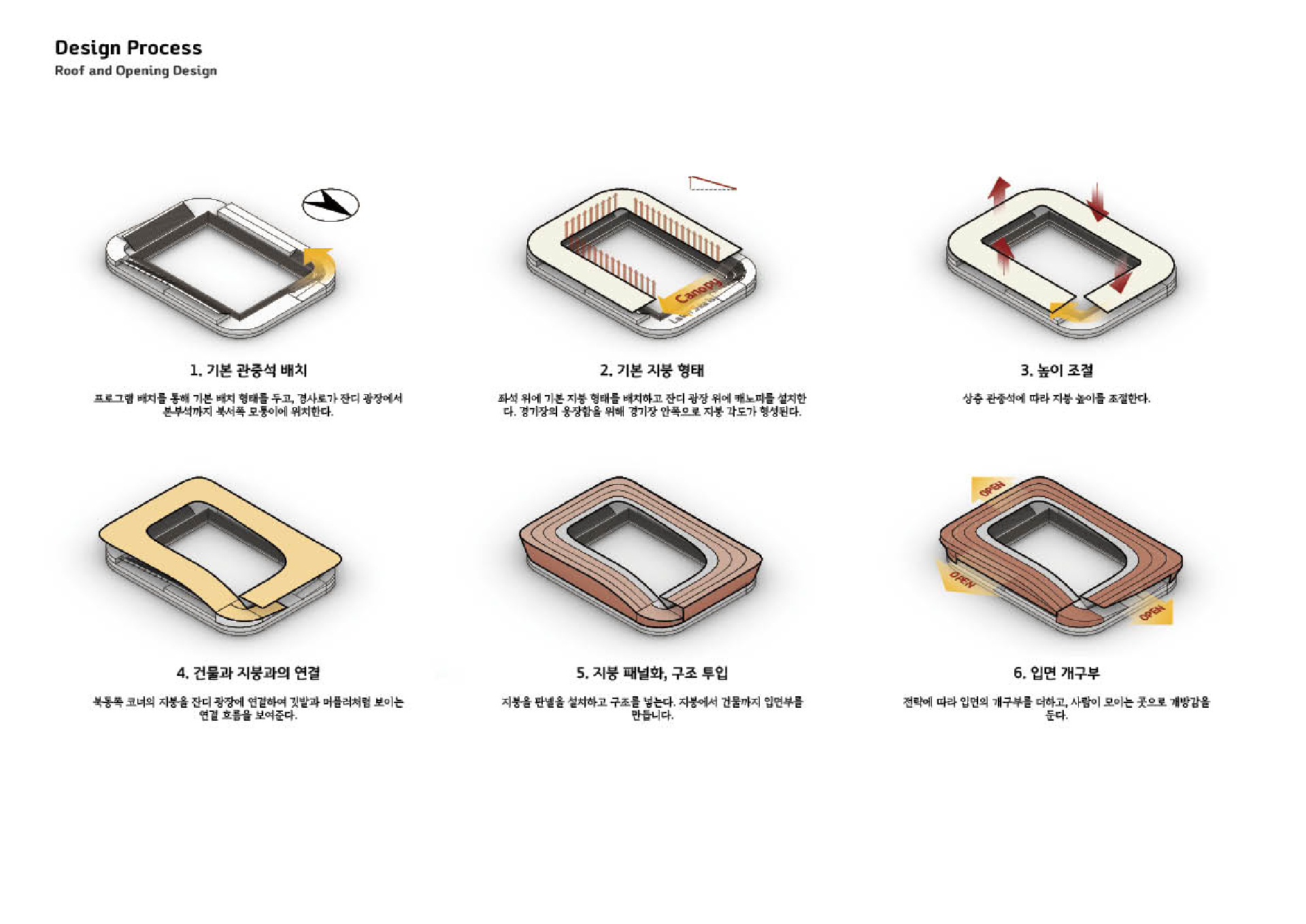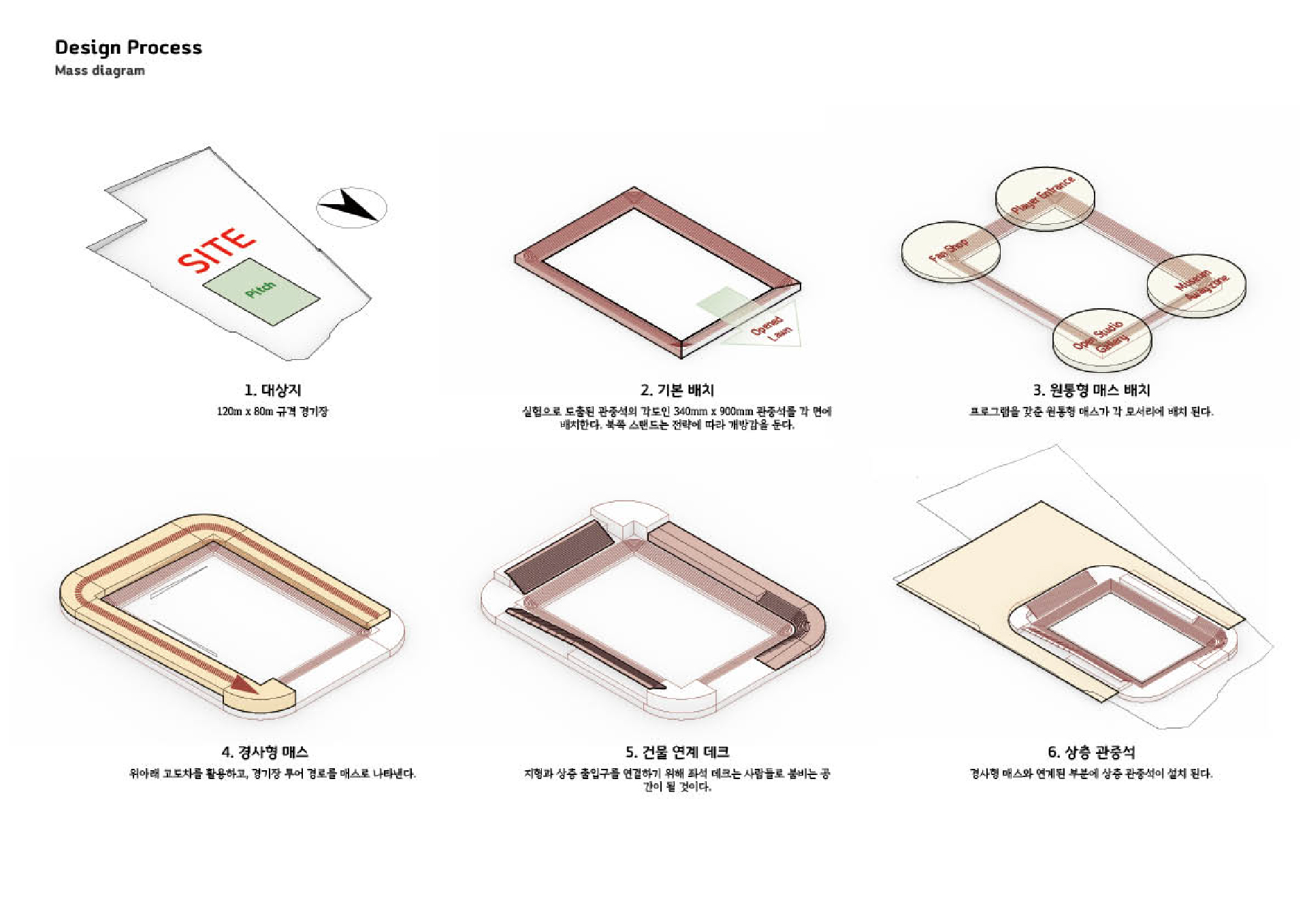 앞뒤 대지 단차가 10m 인점을 이용하여 서측 박물관에서 동측으로 상승하는 슬로프형 매스 즉 서동측으로 높이 차 그리고 서포터석의 웅장함을 위해 남측에도 높이차를 두어 웅장함을 두었다.