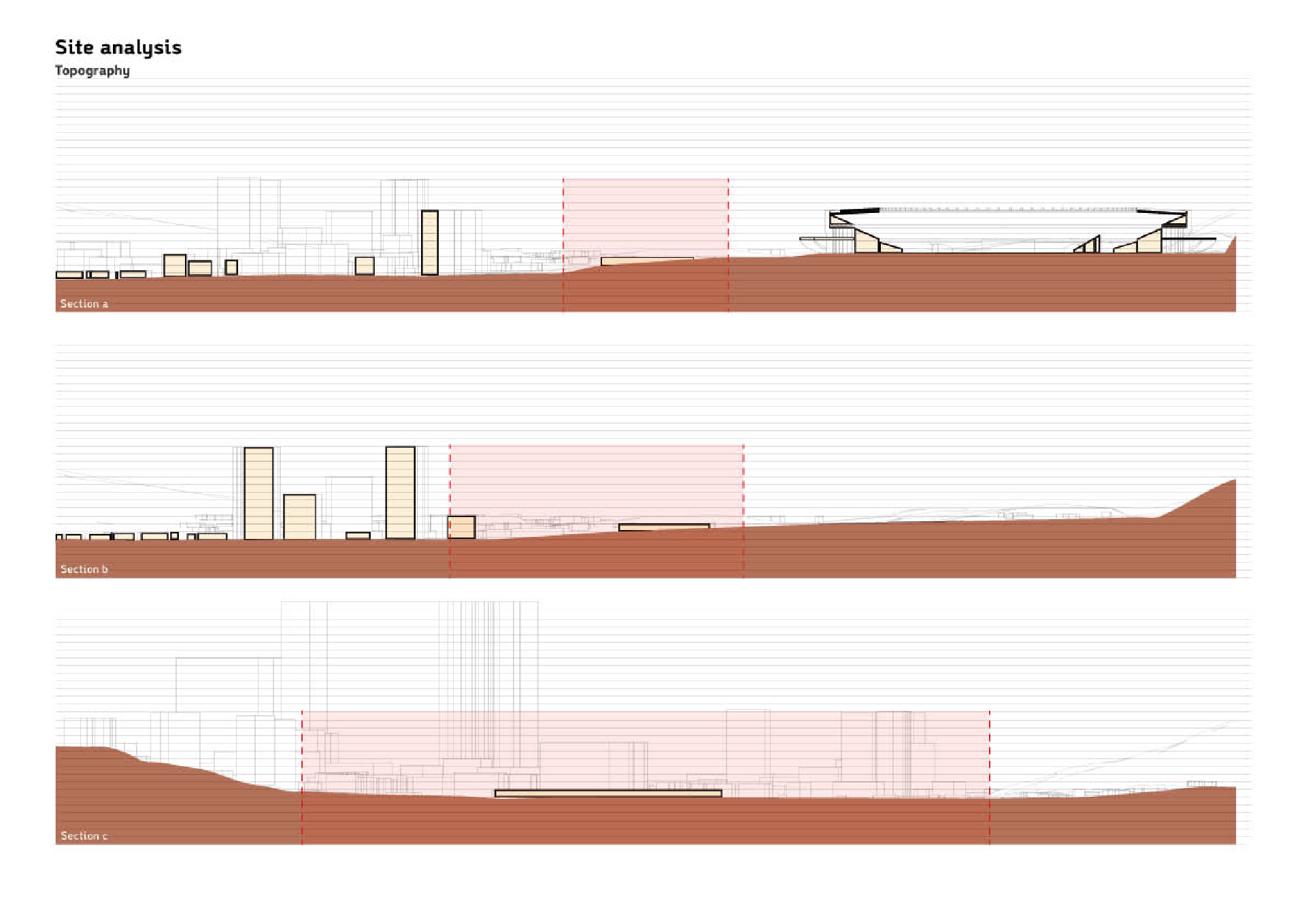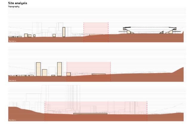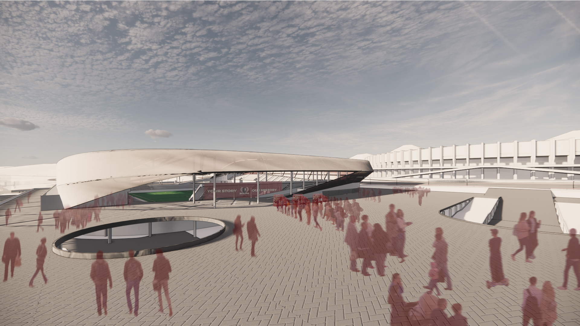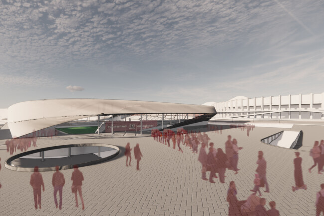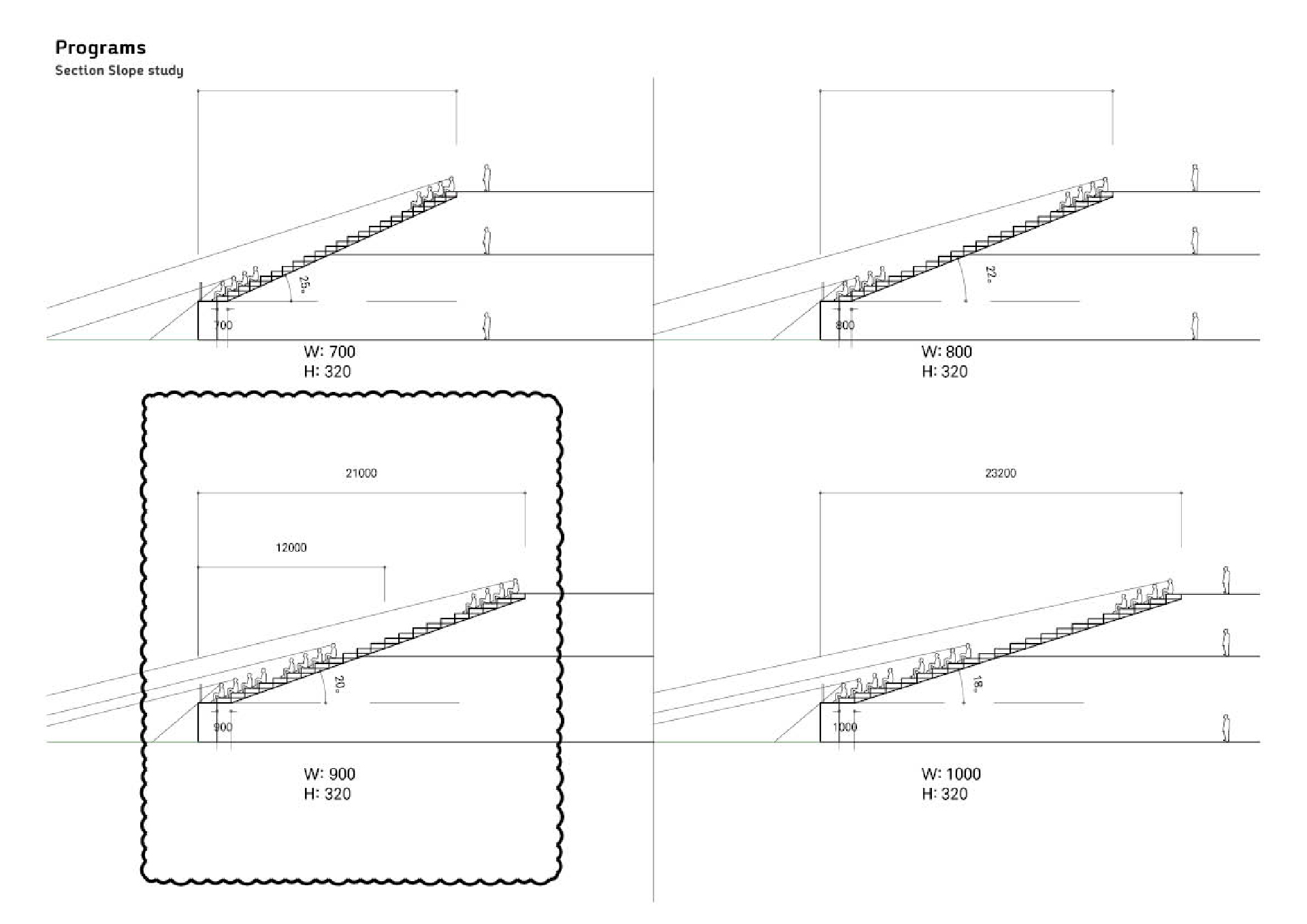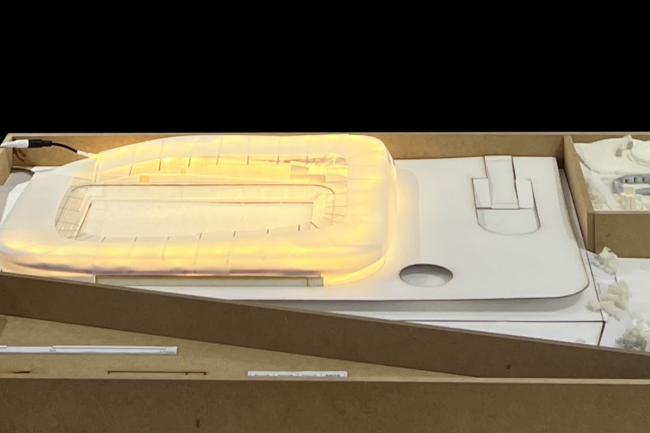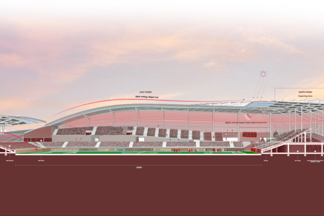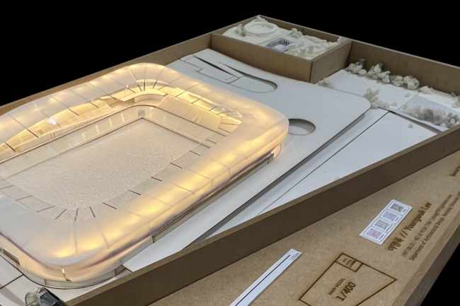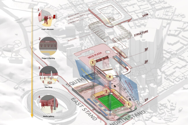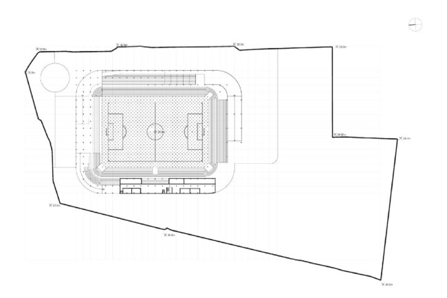 앞뒤 대지 단차가 10m 인점을 이용하여 서측 박물관에서 동측으로 상승하는 슬로프형 매스 즉 서동측으로 높이 차 그리고 서포터석의 웅장함을 위해 남측에도 높이차를 두어 웅장함을 두었다.