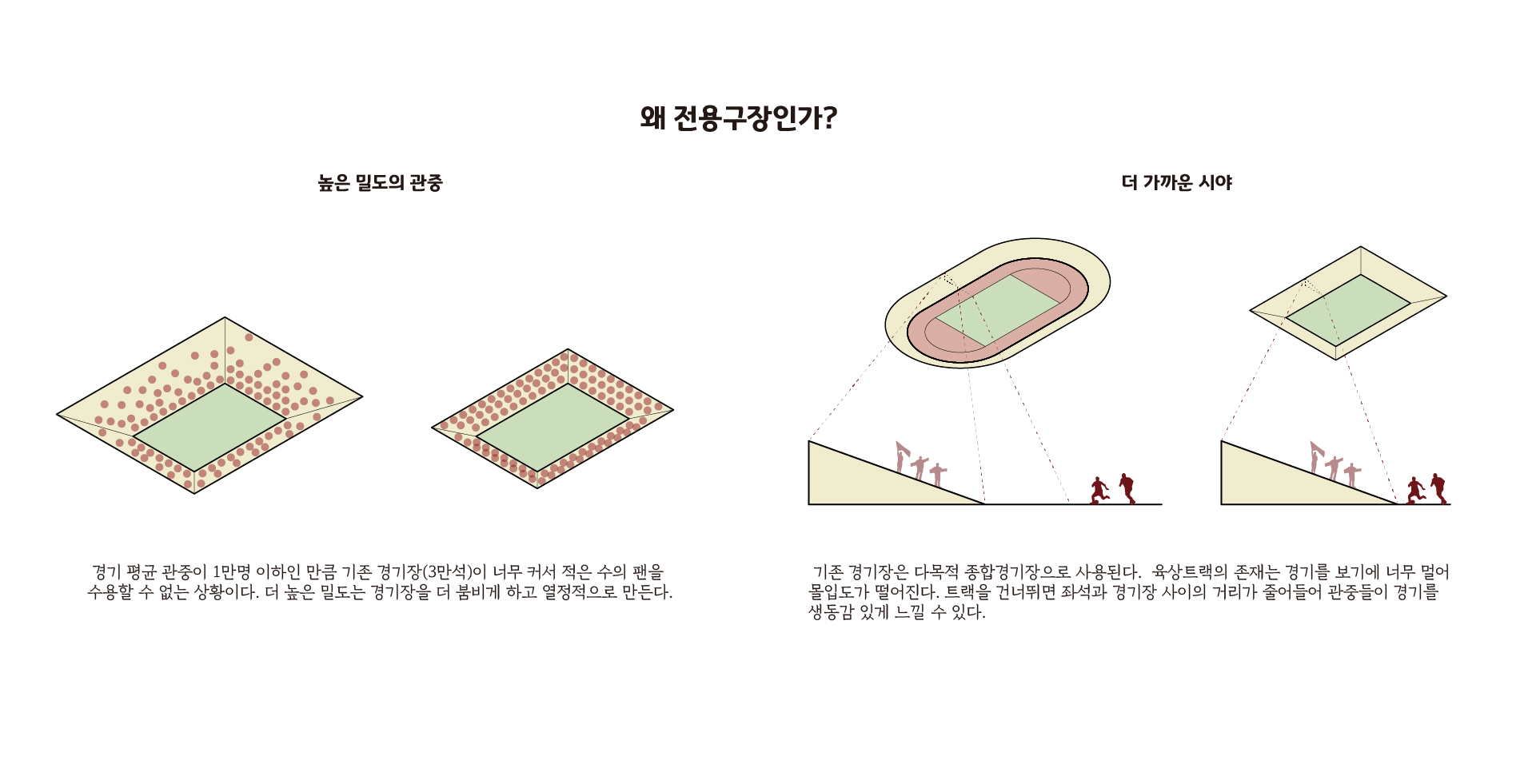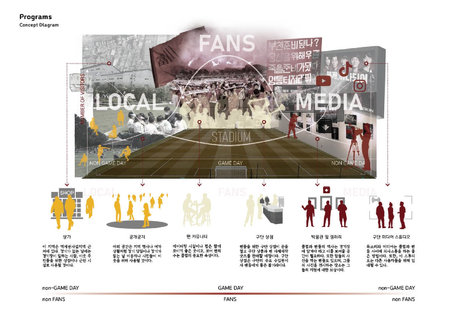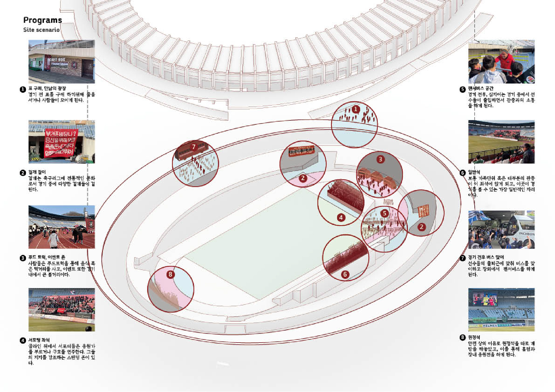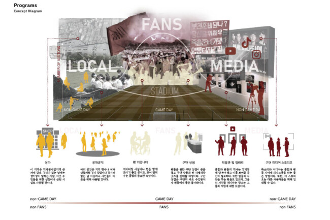 현재 홈구장에서 일어나는 현상들을 정리했다. 경기 뿐만 아니라, 운동장 외에 관중석 및 관람 시설들에서 다양한 이벤트들이 일어나고, 이런 현상들이 구단의 운영 방향 그리고 관중으로 하여금 기억과 추억으로 남게 된다. 이 모든 부분을 새 구장에 새로운 건축의 언어로 표현이 되도록 한다.