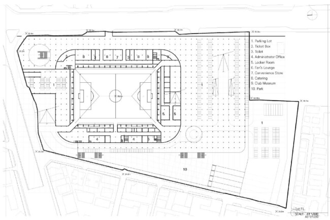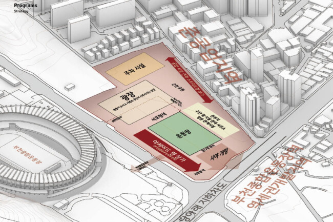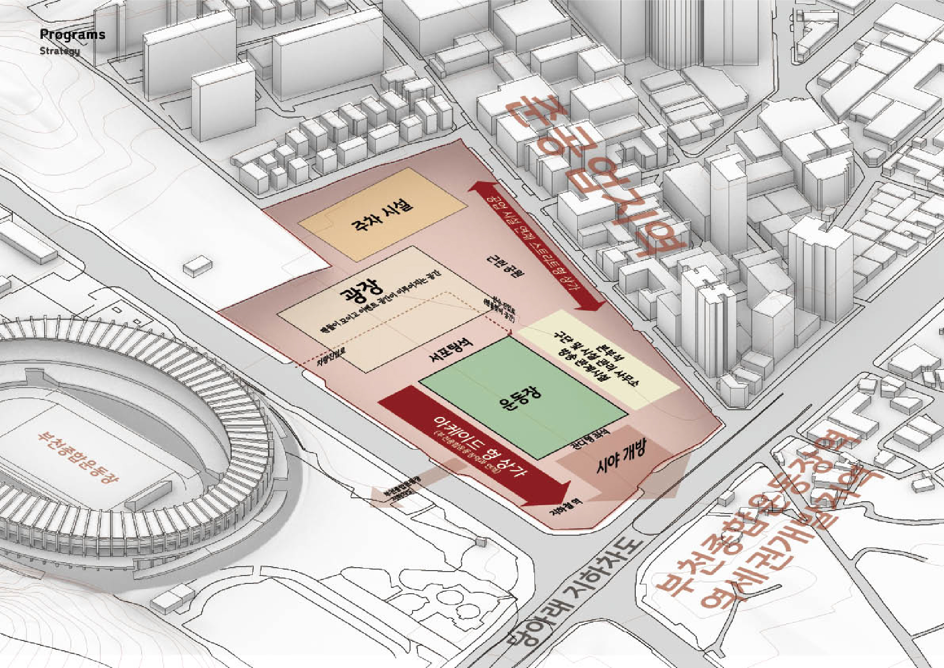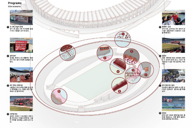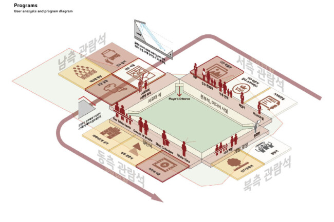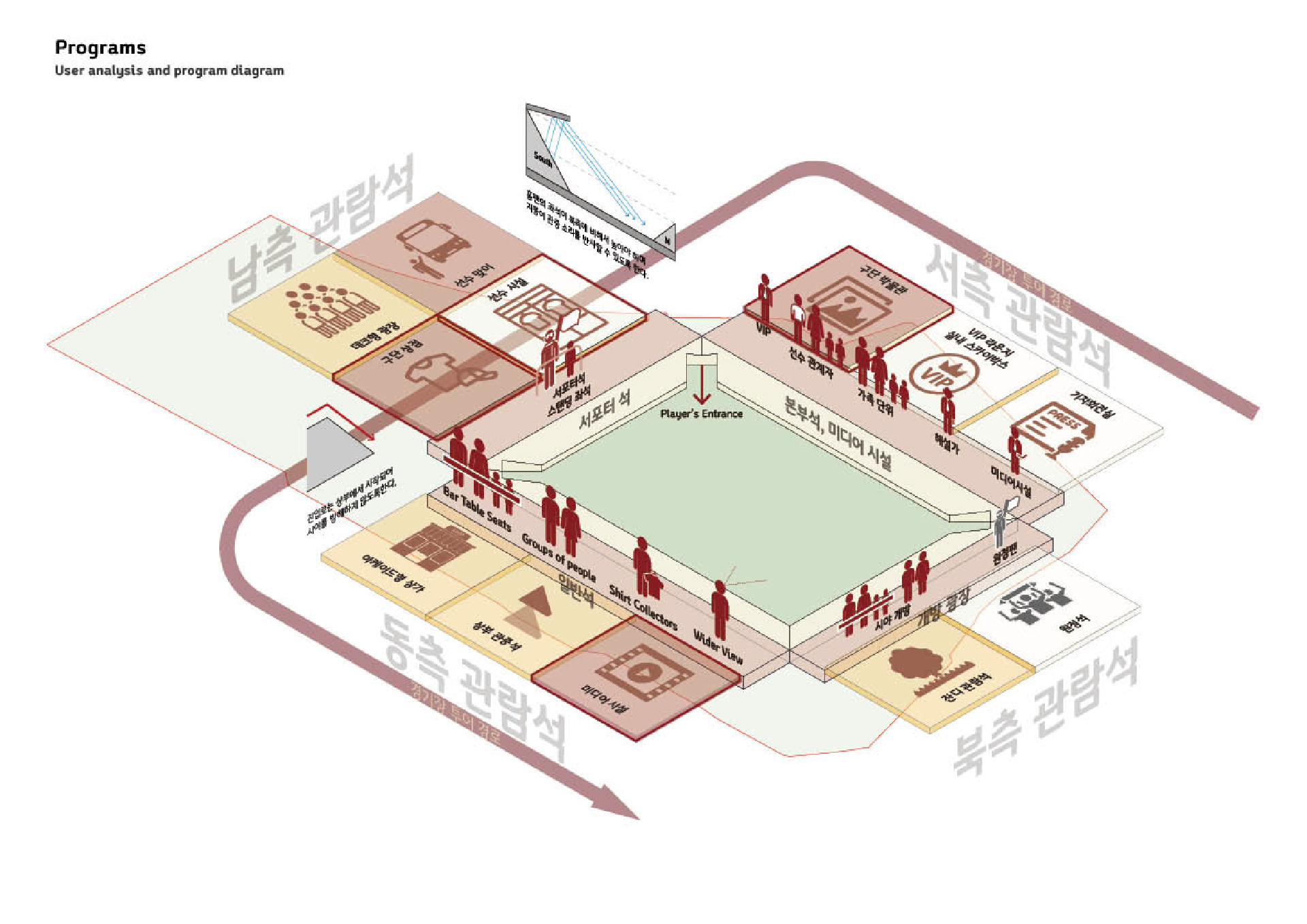 프로그램 배치는 전체적으로 경기장 동선을 돌게끔 하였으며, 전략에 따라 서(본부석), 남(서포터석), 동(일반석), 북(오픈잔디광장, 원정석)을 두었고 전체적으로 경기장 내부를 볼수 있게끔 하였다.