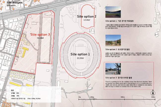 현재 30000석 규모의 부천종합운동장에는 다양한 도시공단 및 체육시설이 있고, 시야와 밀도 부분 해결을 위해 가변석을 설치 하였으나, 안정성 면이나 최대 인원 수용이 부족하다는 점이 있다. 10000석 규모의 경기장 설치를 위해 면적 면으로 적합한 외부 주차장 부지를 사용하고자 한다.