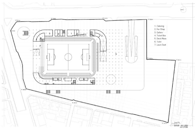 좌석은 약 10500석 규모를 두었고, 사람의 진입이 많은 곳에 2단의 스탠드 역세권 부지 및 역 사거리가 있는 곳에 개방감을 둔 잔디형 좌석을 두었다. 접근성이 있는 곳에 아트리움형 광장을 두었다.