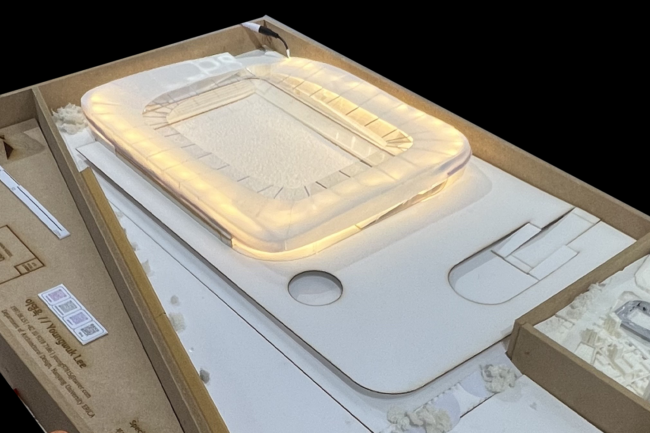 외피도 또한 이러한 매스의 선형 형태를 강조하기 위해 선형 LED 조명 및 랜드스케이핑을 활용하여 외피와 지붕 디자인 또한 진행했다. 또한 투명감과 발광 재료를 사용하여, 지역의 랜드마크로 자리잡을 수 있는 가능성을 두었다.