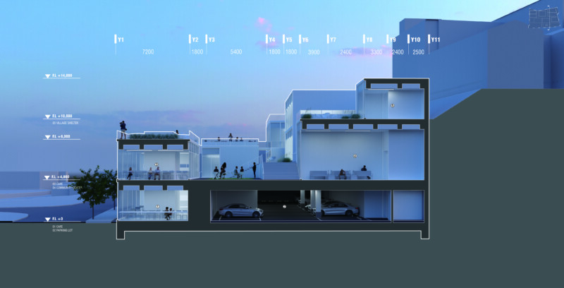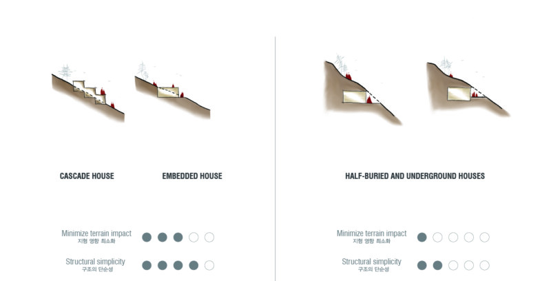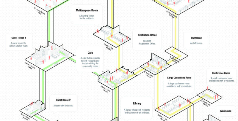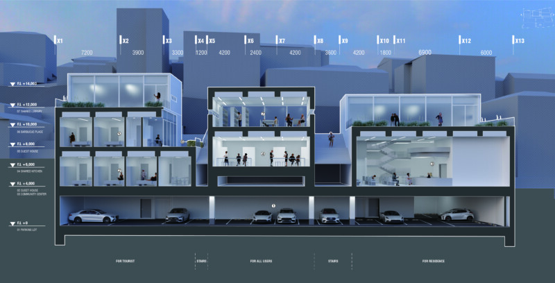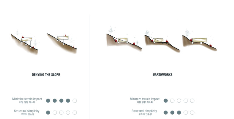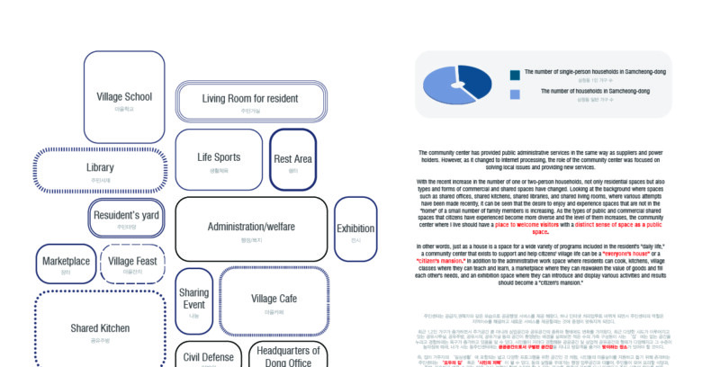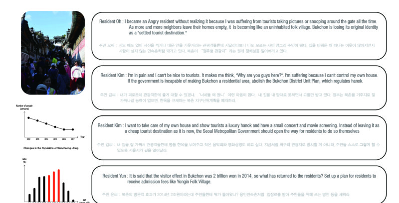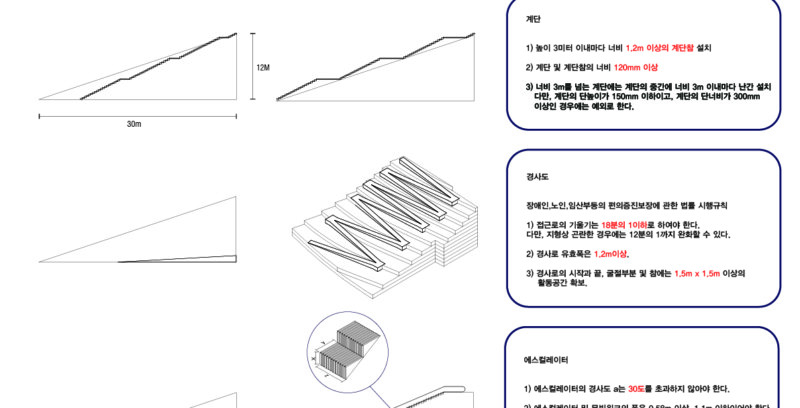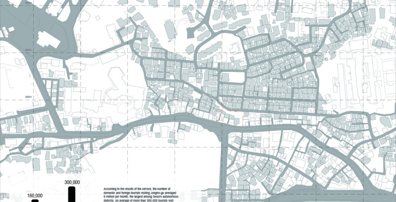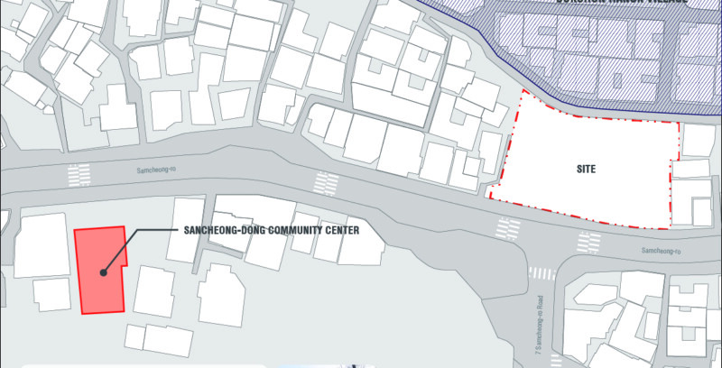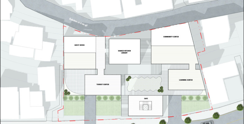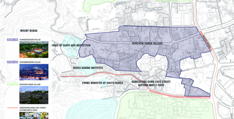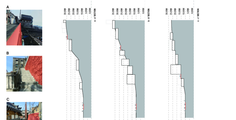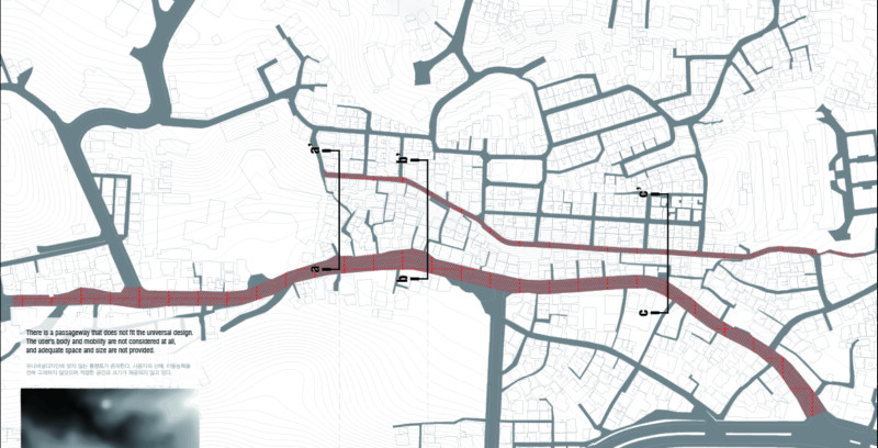 북촌 한옥마을에서, 앉아 쉴 수 있는 곳이 존재하는 삼청동 카페거리까지 이동할 수 있는 길은 크게 3군데가 존재한다. 3군데의 단면을 보면 단차가 많게는 20m, 적게는 5m가 존재하고, 유니버설 디자인에 맞지 않게 설계되어 있다. 이 통로들은 많은 관광객들 뿐만 아니라, 정주형 관광지인 북촌한옥마을 주민들에게도 불편함을 겪게 한다. 그래서 주민과 관광객 모두가 이용할 수 있는 시설을 디자인 함과 동시에 북촌-삼청동카페거리를 연결하는 길의 가파른 경사를 건축적으로 해결하고자 한다.