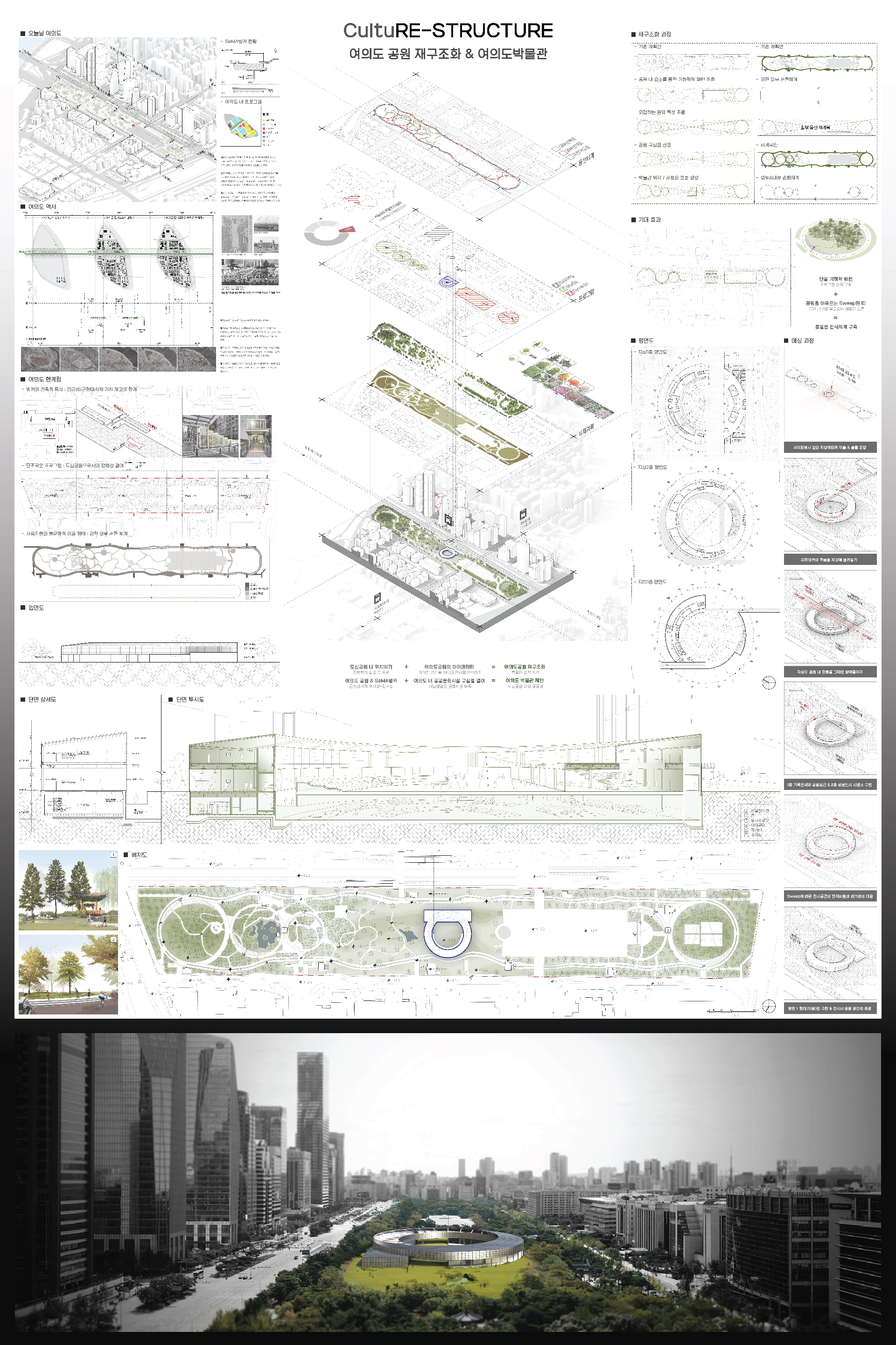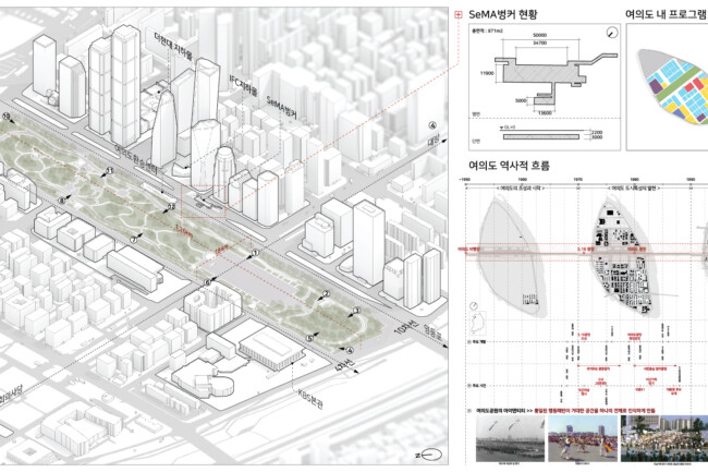 여의도 공원이 갖는 물리적 조건들과 정체성을 바탕으로 새로운 문화적 질서를 도입하는 전략에 대해 고민하고, 공원 자체의 통일된 조직과 도심공원으로서 공공문화의 구심점이 될 수 있는 박물관을 함께 제시함으로써 여의도의 새로운 방향성에 대해 깊게 탐구한다
