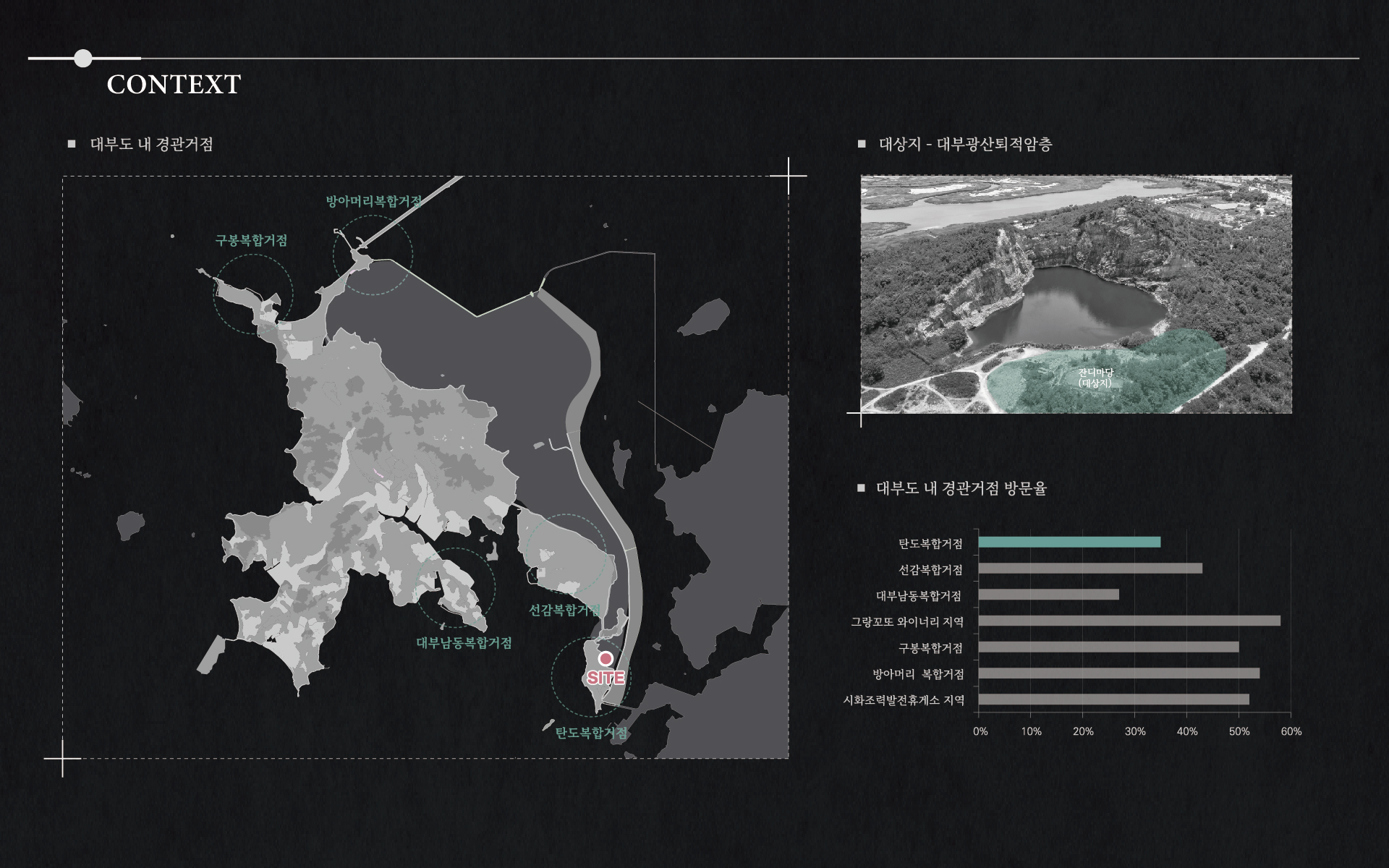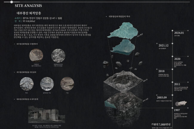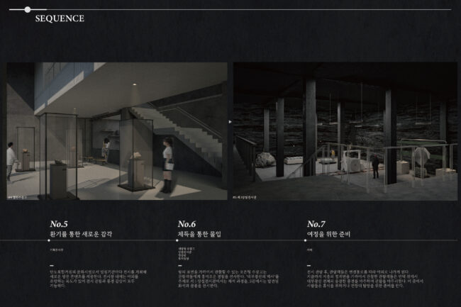 관람객들은 이 곳에 방문 시 가장 먼저 열린 도서관을 마주하게 된다. 그들은 멀리서 보기만 했던 지질층을 가까이서 관찰하고 만지는 색다른 경험을 하게 된다. 그 후 다음과 같은 시퀀스를 통해 각각의 장소를 방문하여 다양한 감각과 경험을 통해 자신만의 방식으로 장소를 기억하게 된다.