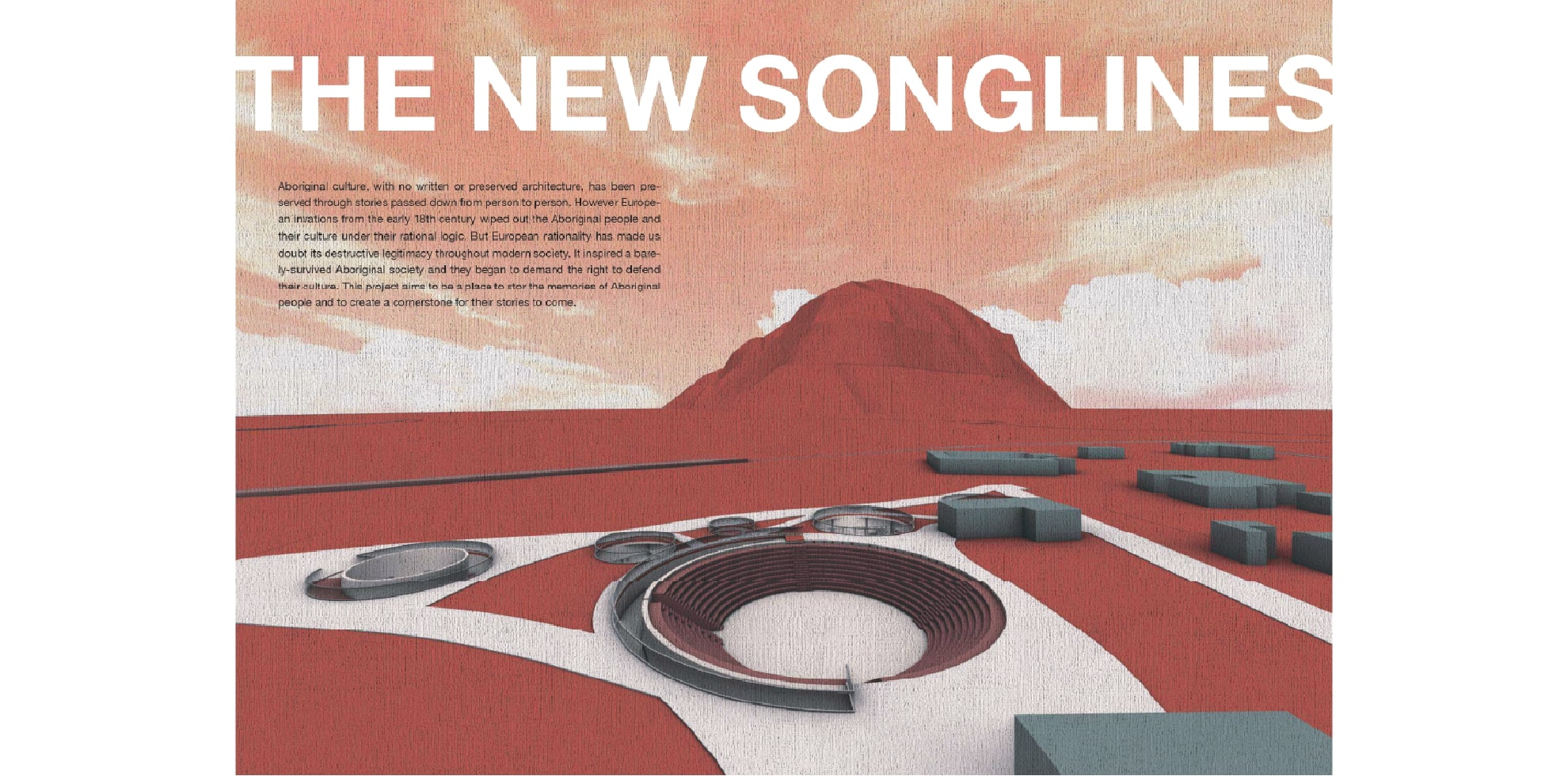 기록된 문서나 보존된 건축물이 없는 원주민 문화는 사람에서 사람으로 전해지는 이야기를 통해 보존되어 왔습니다. 그러나 18세기 초로부터의 유럽의 침략은 그들의 이성적인 논리 아래 원주민과 그들의 문화를 전멸시켰습니다. 그러나 유럽의 이성은 우리에게 현대 사회 전반에 걸쳐 파괴적인 정당성을 의심하게 만들었습니다. 그것은 간신히 살아남은 원주민 사회에 영감을 주었고 그들은 그들의 문화를 보호할 권리를 요구하기 시작했습니다. 이 프로젝트는 원주민의 기억을 저장하고 그들의 이야기가 다가올 수 있도록 초석을 만드는 것을 목표로 합니다.