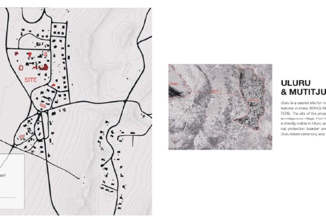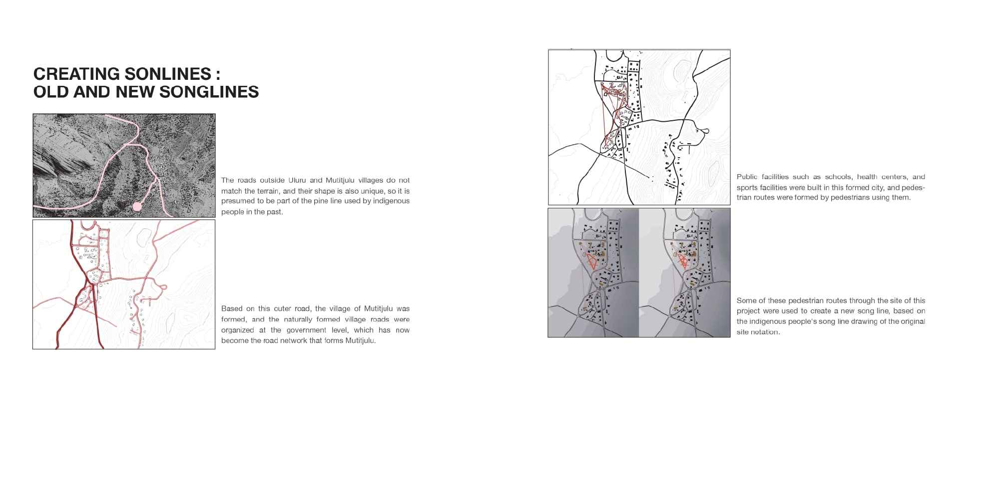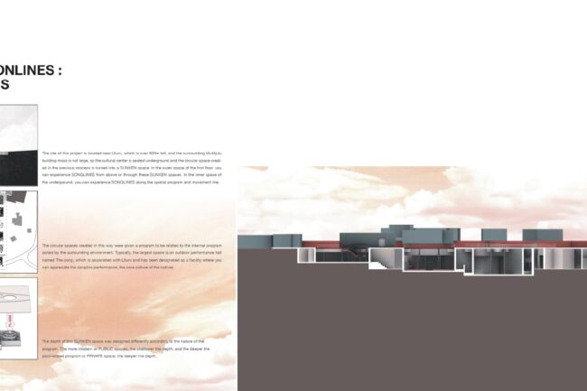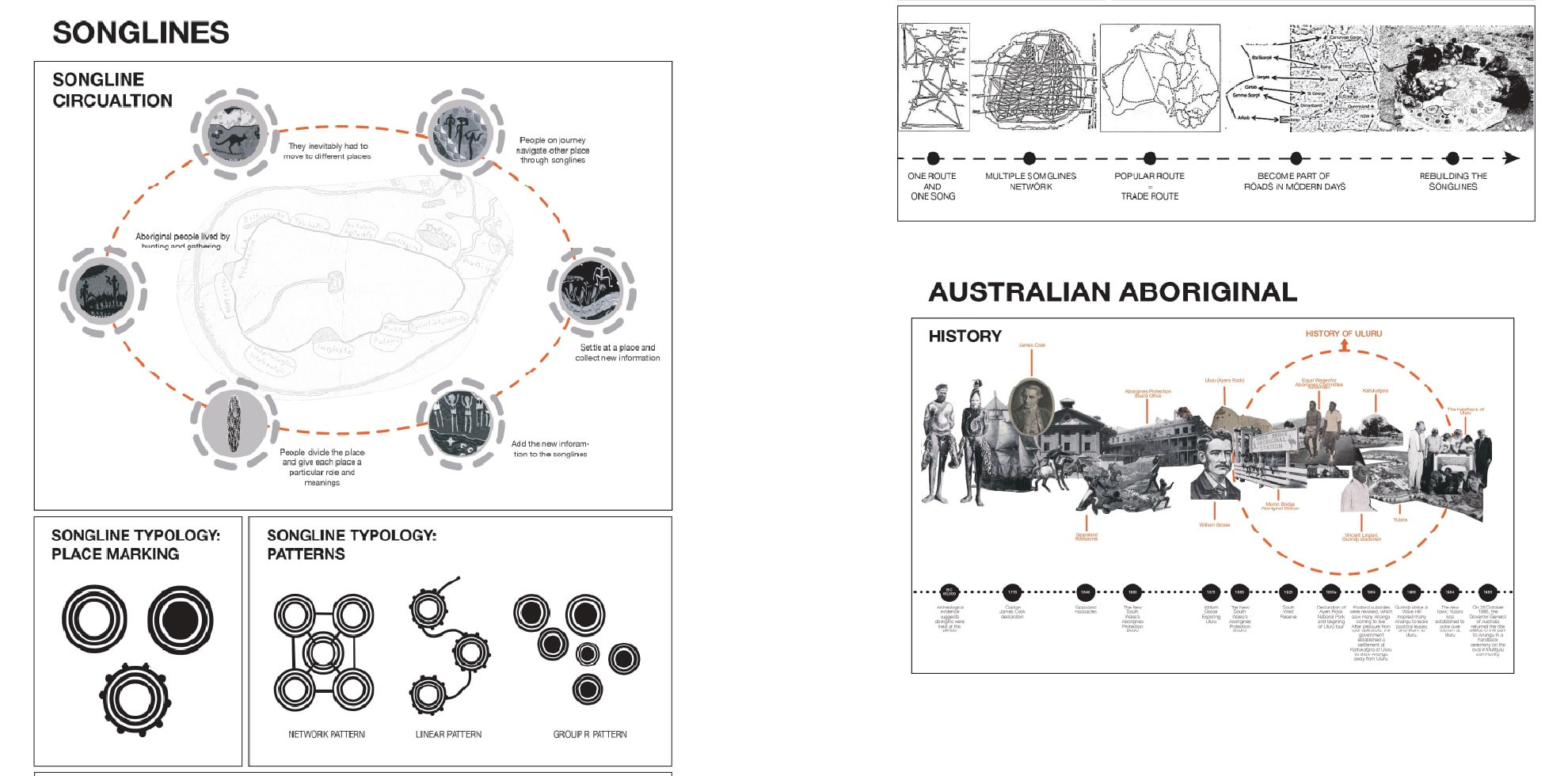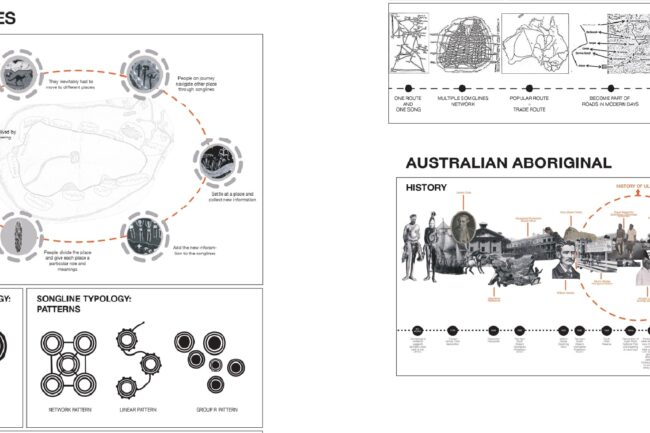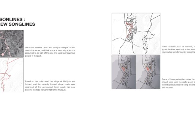 이러한 송라인은 노래로써 전승 될 뿐 아니라 벽화로도 남겨졌는데 독특한 점은 주요 장소가 원형으로 표시된다는 점입니다. 저는 이러한 송라인을 메인컨셉으로 설계를 진행 하였습니다.