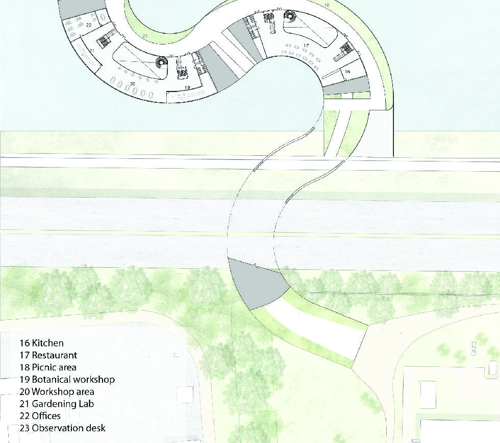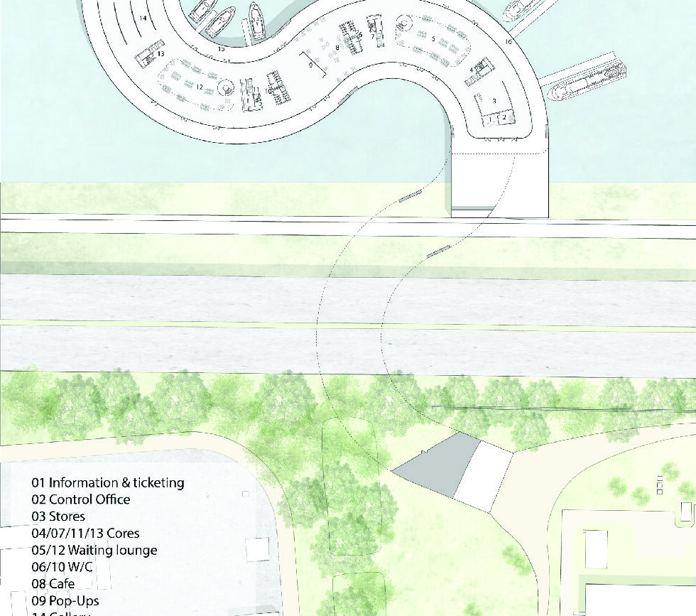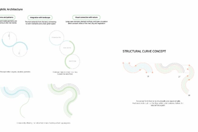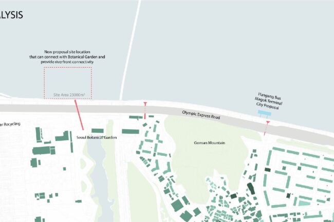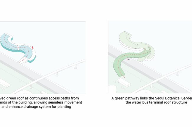 이 수상버스 터미널은 단순한 교통 인프라를 넘어, 도시와 자연을 연결하는 새로운 공공 공간으로 제안됩니다. 곡선형의 건축 매스는 한강의 흐름을 닮아 주변 환경과 조화를 이루고, 옥상 정원과 녹색 보행로는 서울식물원에서 수변까지 이어지는 생태적 흐름을 완성합니다.