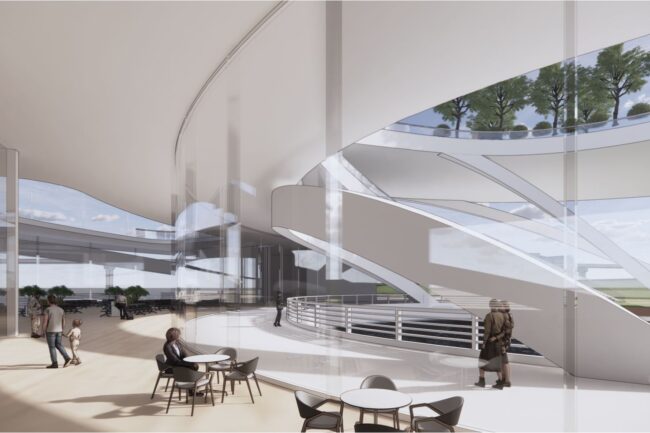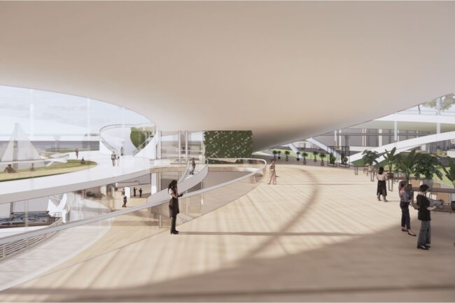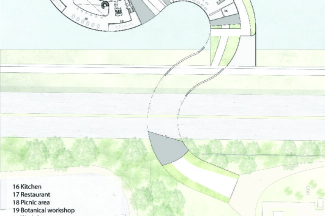 2층의 곡선형 지붕은 건물 양쪽 끝에서부터 연속적인 접근 경로를 제공하며, 2층 테라스 공간으로도 자연스럽게 연결됩니다. 그리고 서울식물원에서부터 시작되는 녹색 보행 경로가 건물의 옥상으로 이어집니다.