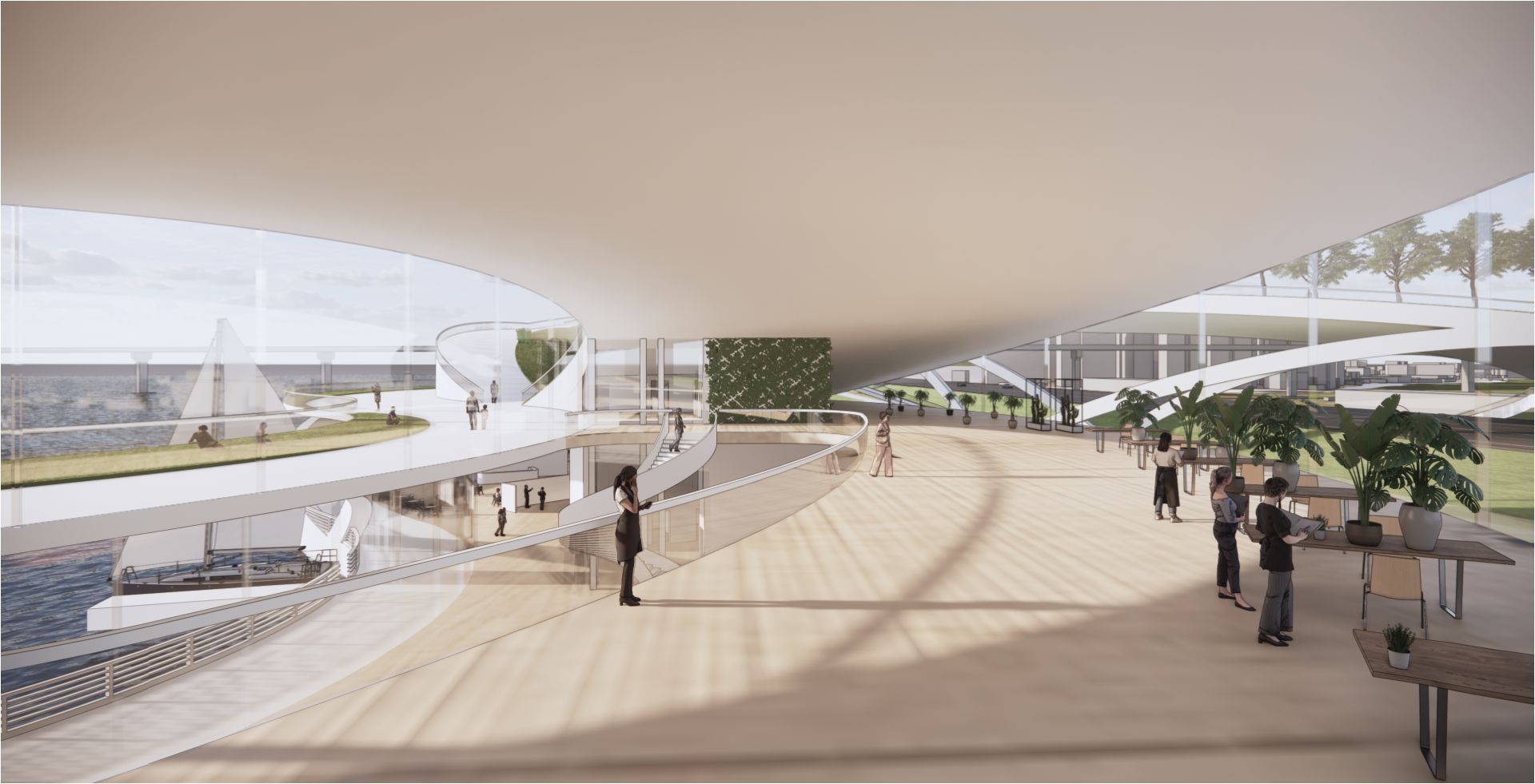 건물 구조는 곡선을 기반으로 하여 형태 자체가 구조가 되도록 설계되었으며, 고정된 녹색 브리지와 유동적인 수상 플랫폼은 유연한 연결 장치를 통해 안전하고 효율적인 이용을 지원합니다.
