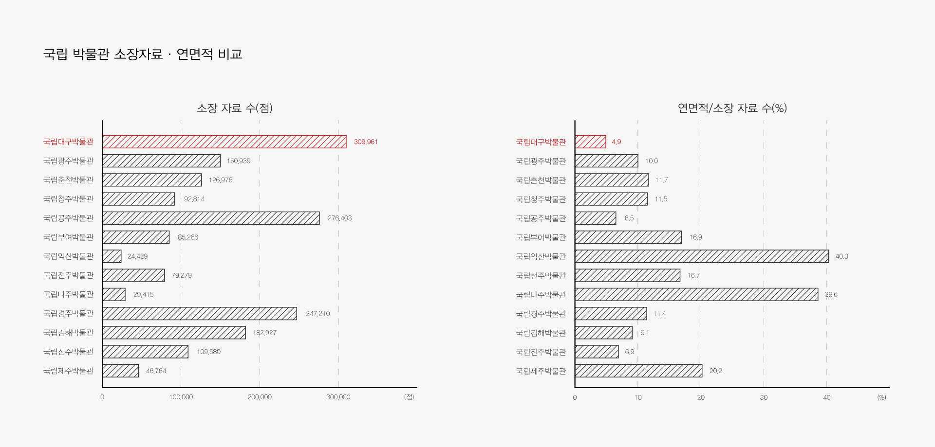 전시면적은 기존에 비해 3~4배의 면적이 필요하고, 수장고는 지하에 위치해 증축 및 관리가 어렵다는 점을 보았을 때, 국립대구박물관은 신축을 통해 문화유산의 효율적인 관리와 시민들에게 더 나은 문화향유공간으로 다가가야 한다.