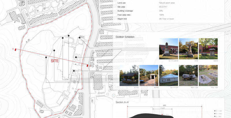 이 대지는 면적이 넓고 경사가 완만하며 숲으로 둘러싸여 관람객들이 전시관람과 산책 및 휴식을 함께할 수 있는 가능성이 있지만, 박물관과 유적공원은 높이 차로 서로 분리되어 있어 대지를 최대한 활용하지 못하고 있다.