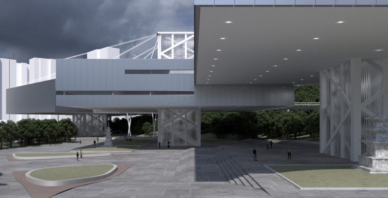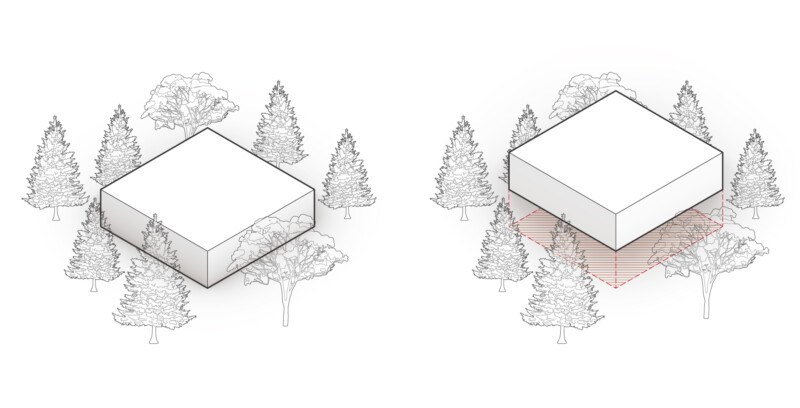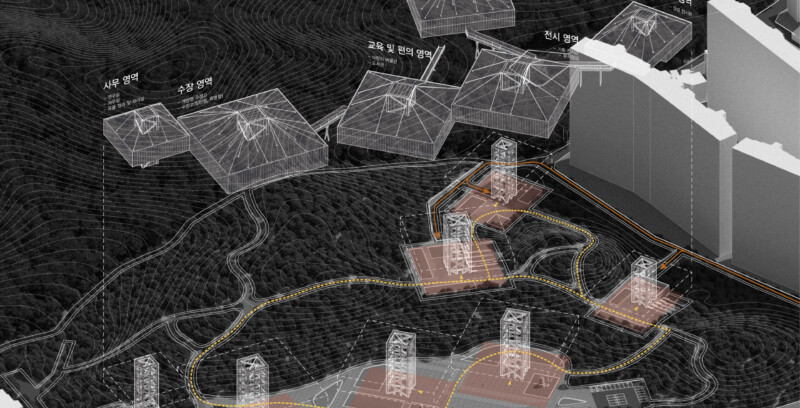 건축물이 숲 내부에 위치하면서도 숲의 면적을 최대한 유지하기 위해 건축물을 띄워 올린다면 건축물이 지표면에서 점유하는 면적을 최소화할 수 있고, 하부에 생기는 Canopy 공간은 야외전시공간, 휴식공간으로 활용될 수 있다.