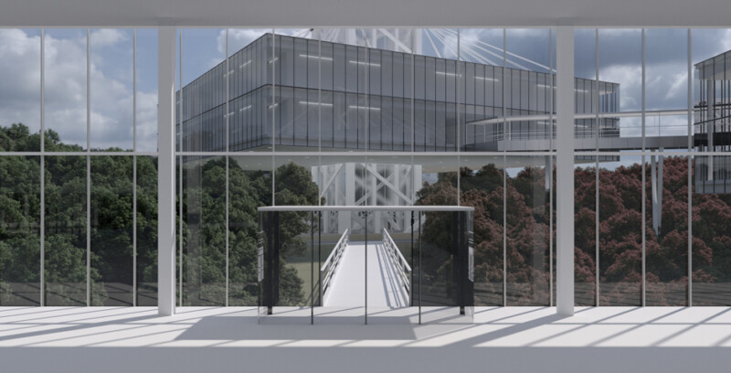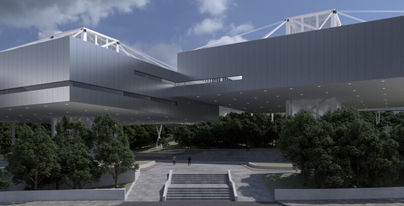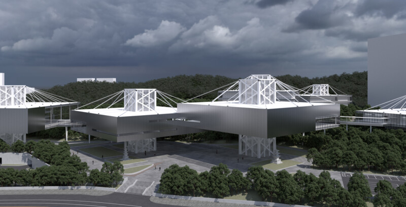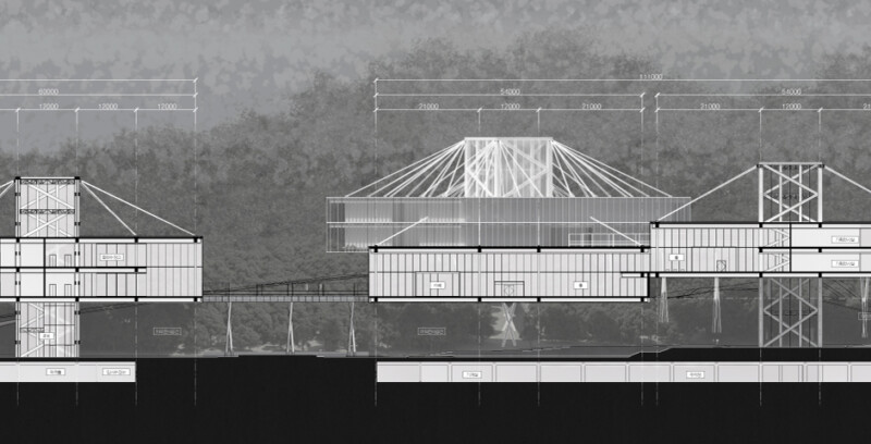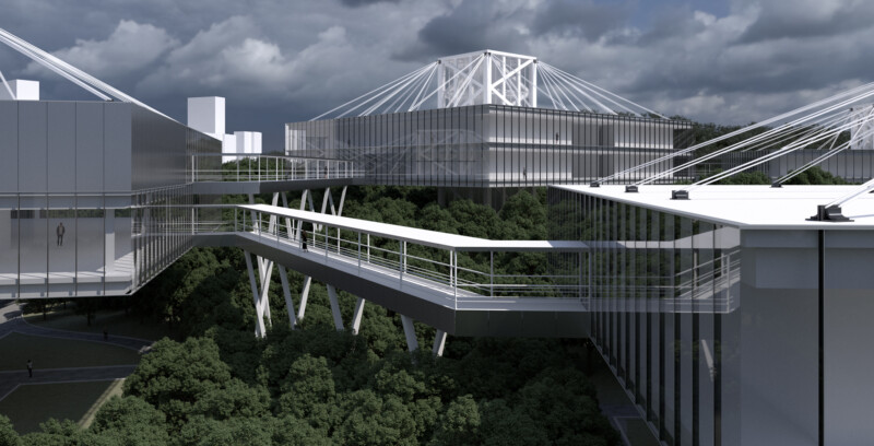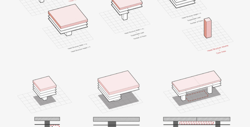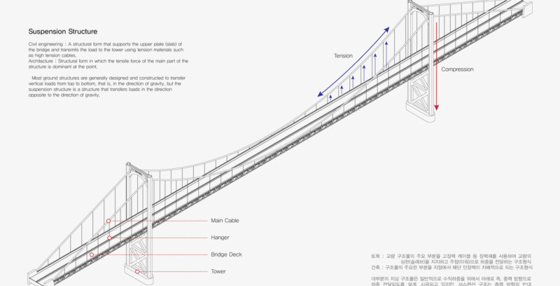 건축물을 띄워 올리는 구조형식에 대해 고민을 했고, 그 중 교량구조에 사용되는 Suspension Structure는 대부분의 지상 구조물이 일반적으로 수직하중을 중력방향으로 전달하는 것과는 반대로 인장재를 사용해 중력 반대방향으로 하중을 전달하는 구조 형식이다.