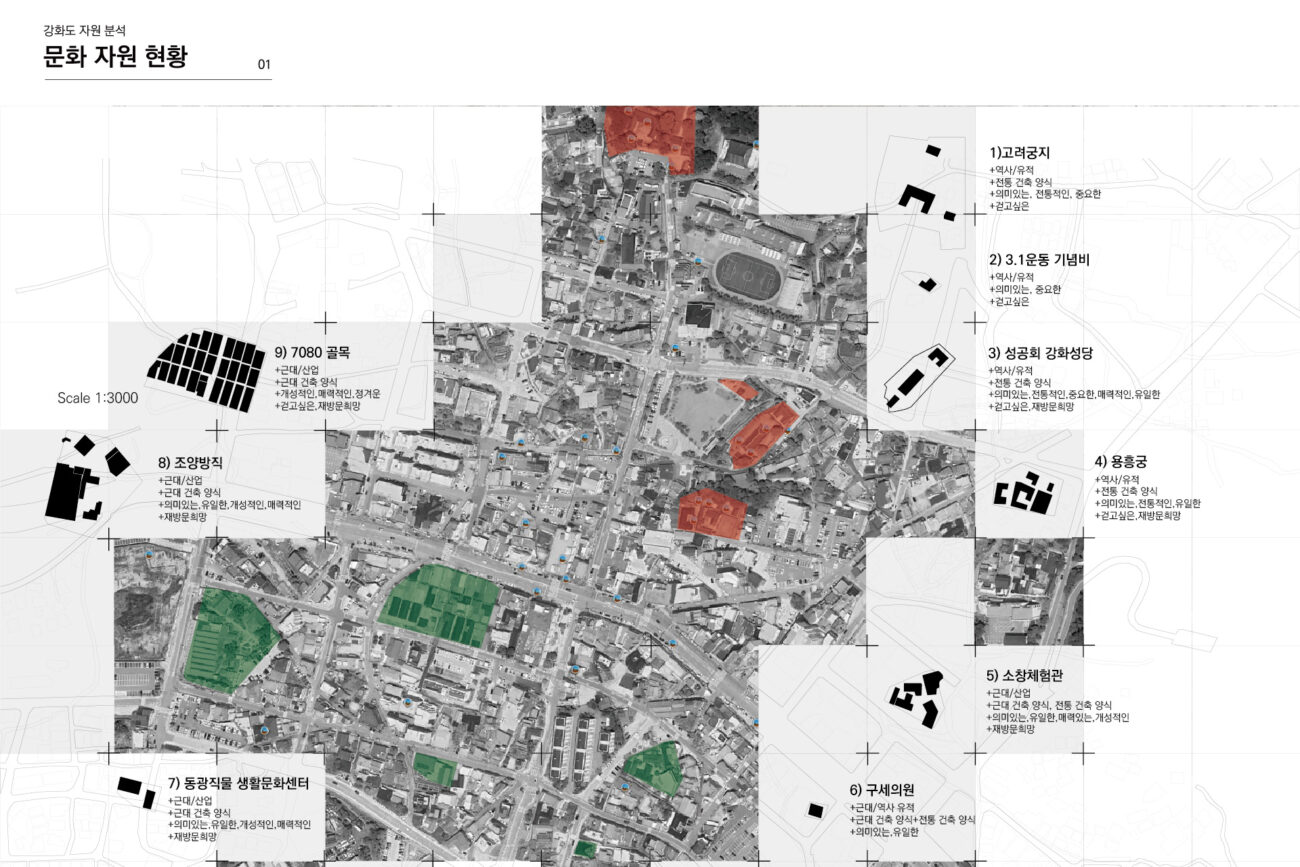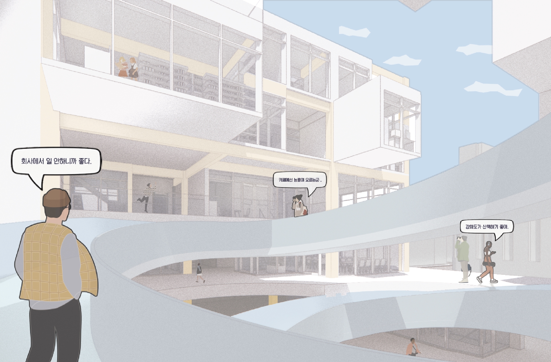 이후 공간을 시각적, 물리적으로 연결시켜 사람들간의 커뮤니티를 활성화시키고, 이를 통해 강화의 작고 소소한 일상과 관계를 직접 느낄 수 있도록 유도한다.