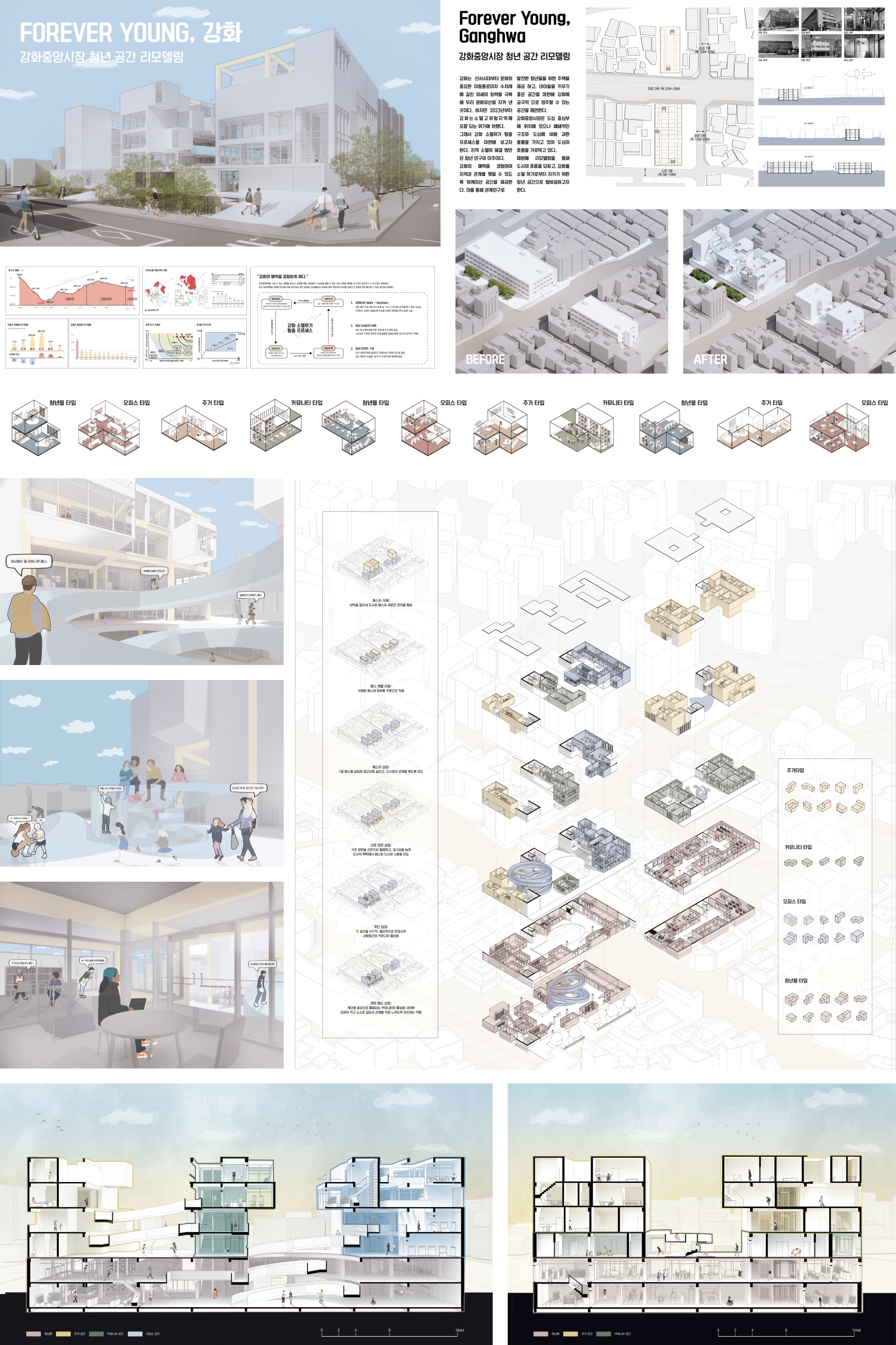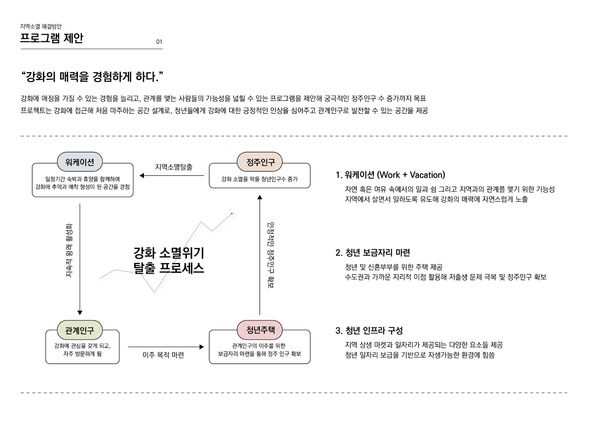 강화의 매력을 경험하고, 지역과 관계를 맺을 수 있도록 외부 청년 인구가 올 수 있는 워케이션 공간을 제공하고, 이를 통해 관계인구로 발전한 청년들을 위한 주택을 제공하고, 아이들을 키우기 좋은 환경을 마련해 궁극적으로 정주할 수 있는 공간을 제안한다.