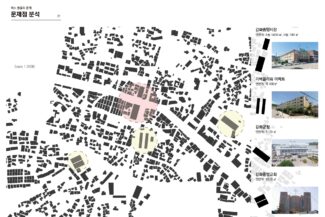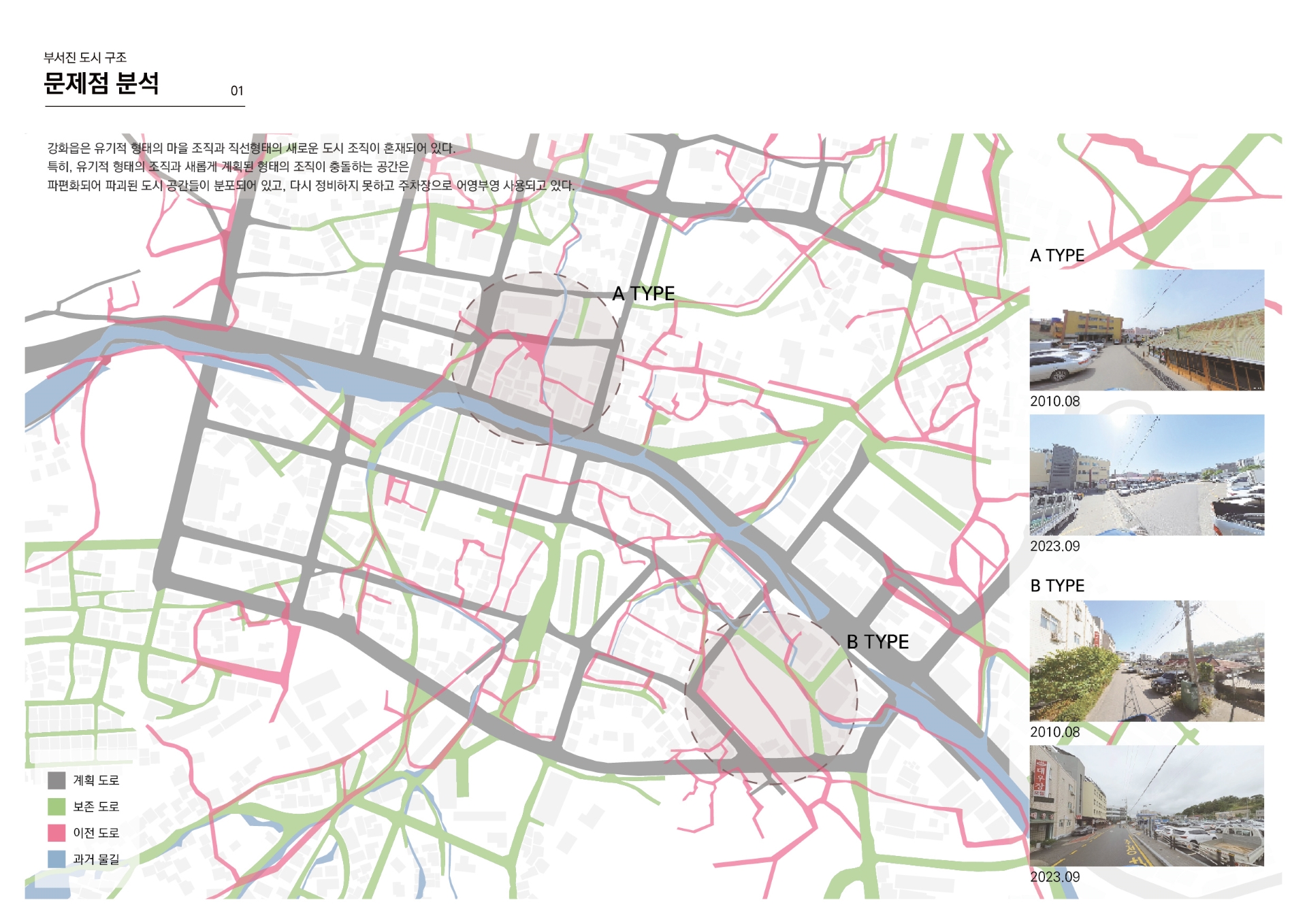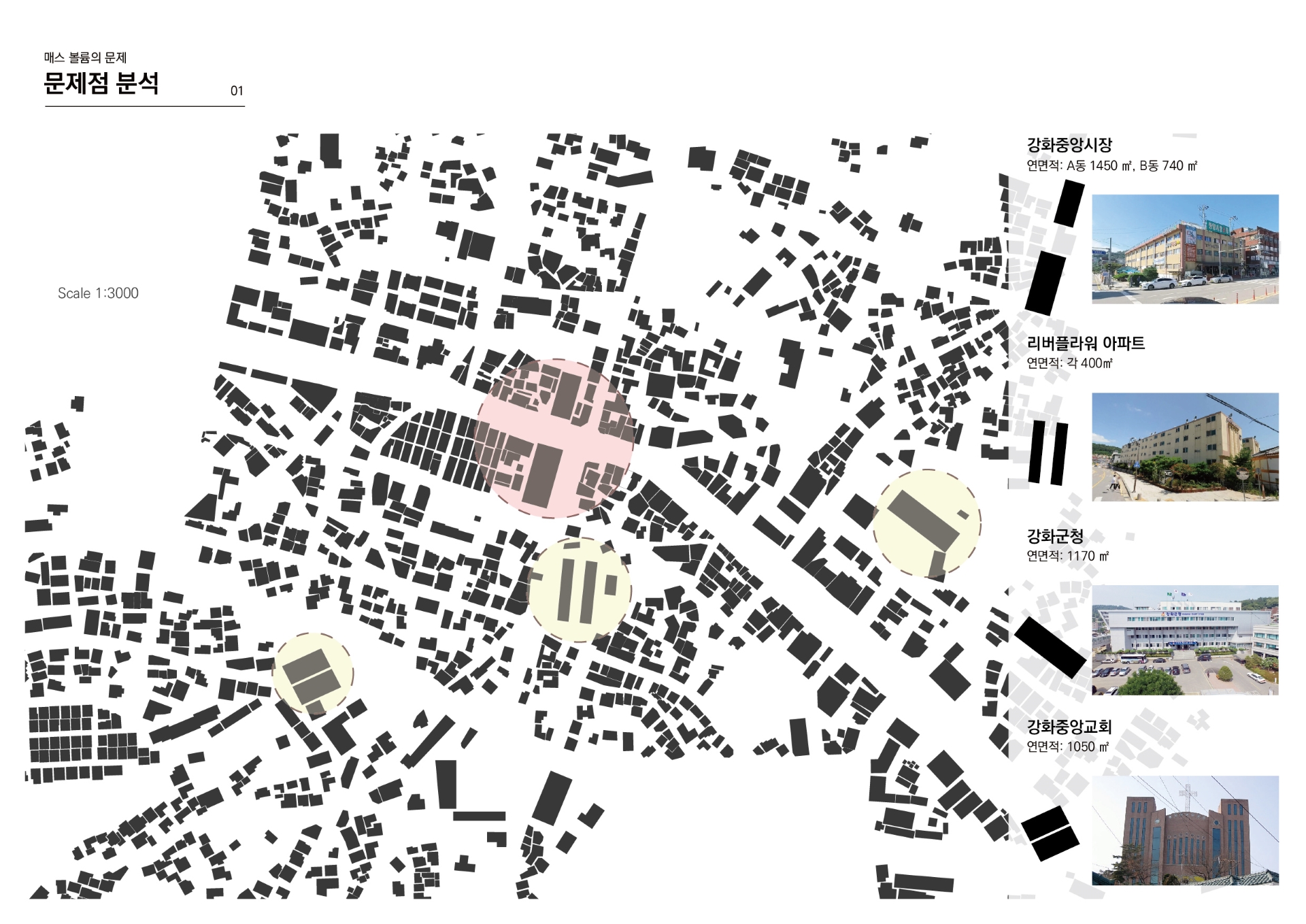강화중앙시장은 도심 중심부에 위치해 있으나 폐쇄적인 구조와 도심에 비해 과한 볼륨을 가지고 있어 도심의 흐름을 가로막고 있다.