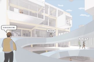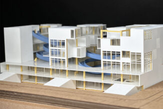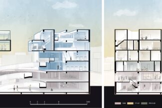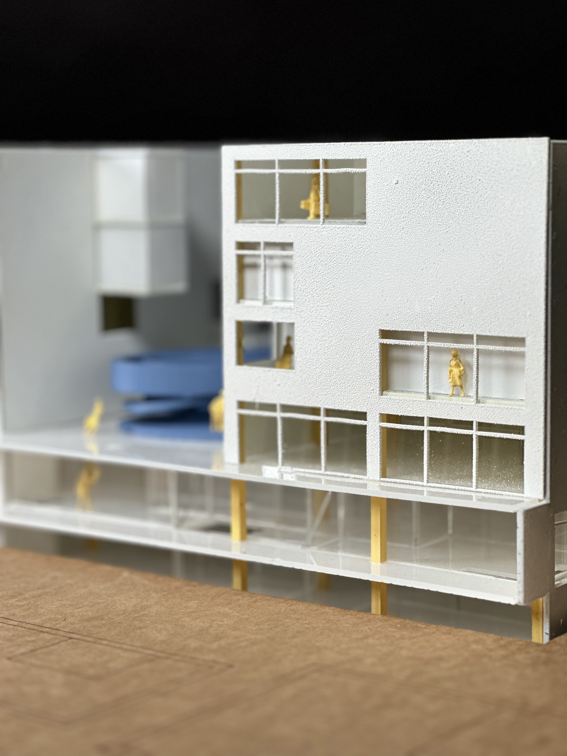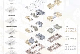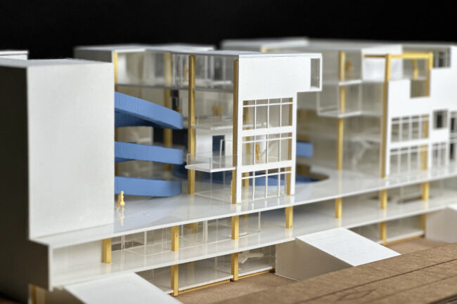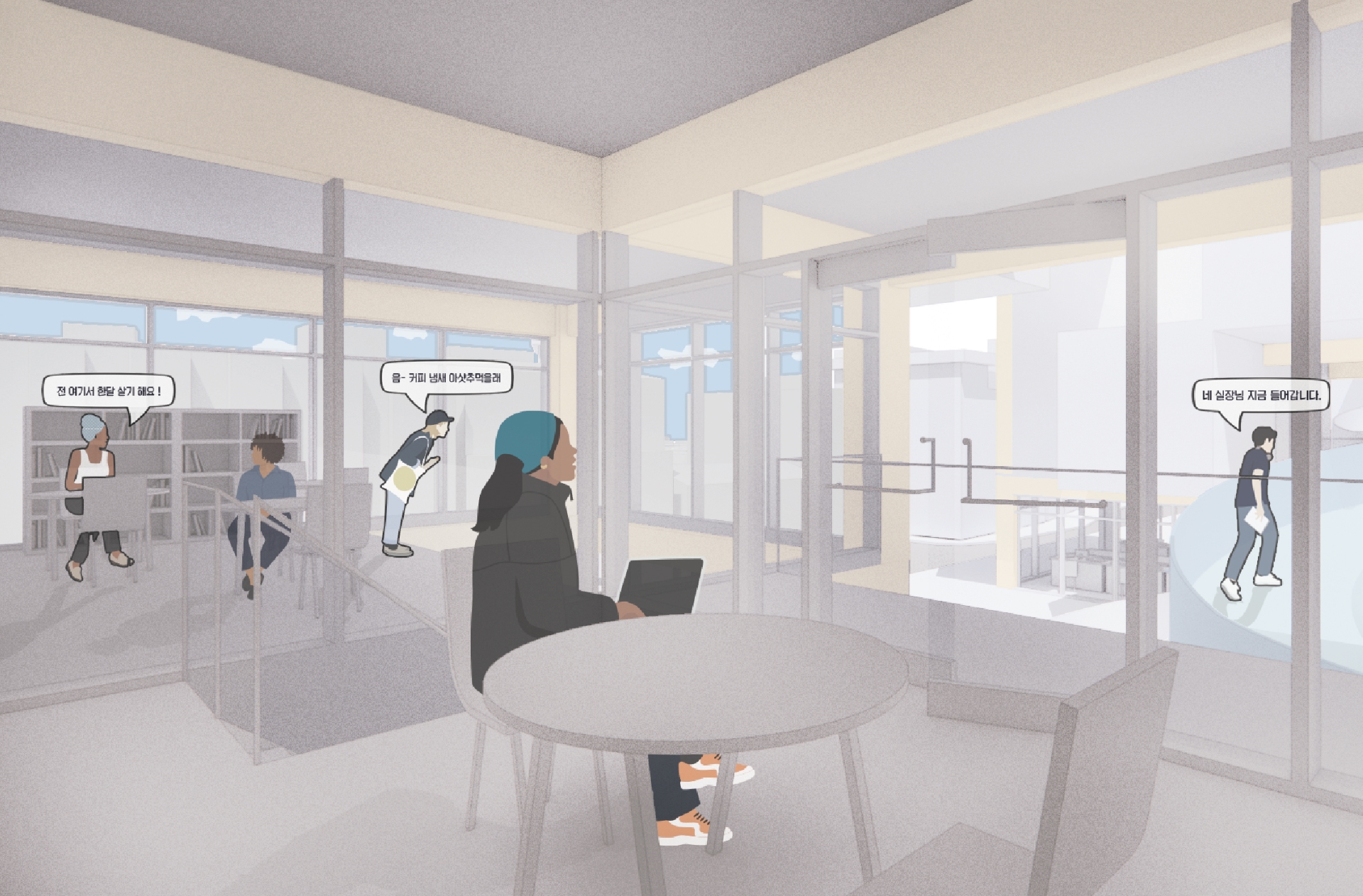 내부는 기존 기둥보다 더 작은 그리드로 나누어 큐브를 형성하고, 평면적으로 겹칠 때보다 블럭유닛을 통해 더 많은 만남과 관계 맺기를 지향한다.
